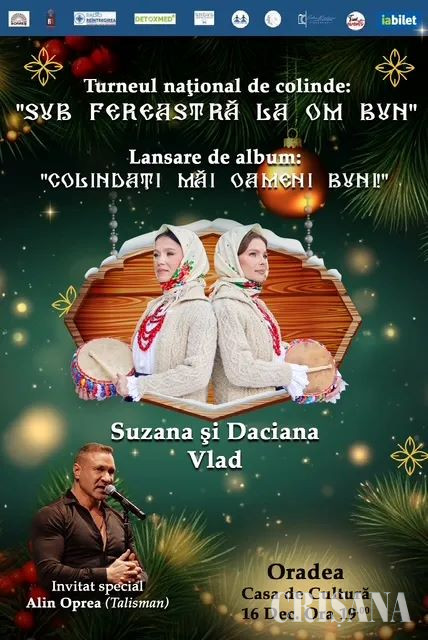 În luna sărbătorilor de iarnă, publicul din România are parte de un eveniment cultural deosebit: turneul național de colinde „Sub fereastră la om bun”, susținut de artistele Suzana și Daciana Vlad, „Gemenele Folclorului Maramureșean”. Cele două surori îndrăgite vor urca pe scenele a 12 orașe din țară, aducând magia colindelor românești mai aproape de sufletele oamenilor. La Oradea, evenimentul va avea loc marți, 16 decembrie, de la ora 19.00, la Casa de Cultură a Sindicatelor, Piaţa 1 Decembrie, nr. 1 (accesul în sală se va face de la ora 18.30).