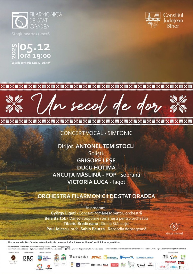 Ziua de 1 decembrie unește sufletele tuturor românilor și le aduce inimile să bată la unison, amplificând mai mult decât oricând dragostea față de patrie, responsabilitatea față de ea și mândria tricolorului purtat în suflet. Cântecele patriotice răsună cu ecouri îndelungate în diferite colțuri ale țării, la început de decembrie, în timp ce Filarmonica de Stat Oradea alege să sărbătorească această zi specială printr-un concert tematic, vineri, 5 decembrie, de la ora 19.00. Evenimentul special, intitulat „Un secol de dor”, are menirea de a intensifica simțirea românească și de a valorifica unele dintre cele mai reprezentative lucrări scrise în ultimul secol de către compozitori români sau pe teme din folclorul românesc: „Concert românesc pentru orchestră”, de György Ligeti, „Dansuri populare românești pentru orchestră”, de Béla Bartók, „Doina Stăncuței”, de Tiberiu Brediceanu, și „Rapsodia dobrogeană”, de Paul Jelescu, în orchestrația lui Sabin Păutza. Invitatul special al serii va fi Grigore Leșe, cel care aduce, de fiecare dată, folclorul din adâncurile pământului românesc și le oferă publicului într-o interpretare unică și greu de egalat. Este primul muzician român care a adus pe scenă, alături de el, artiști tradiționali din Iran, Siria, Pakistan, demonstrând existența interferențelor muzicilor străvechi din România și din Orient. Muzica lui Grigore Leșe se regăseşte pe coloana sonoră a mai multor filme de artă şi documentare din ţară şi străinătate. Alături de el, pe scena filarmonicii orădene, vor urca Ducu Hotima, soprana Ancuța Măslină-Pop și Victoria Luca, la fagot.
