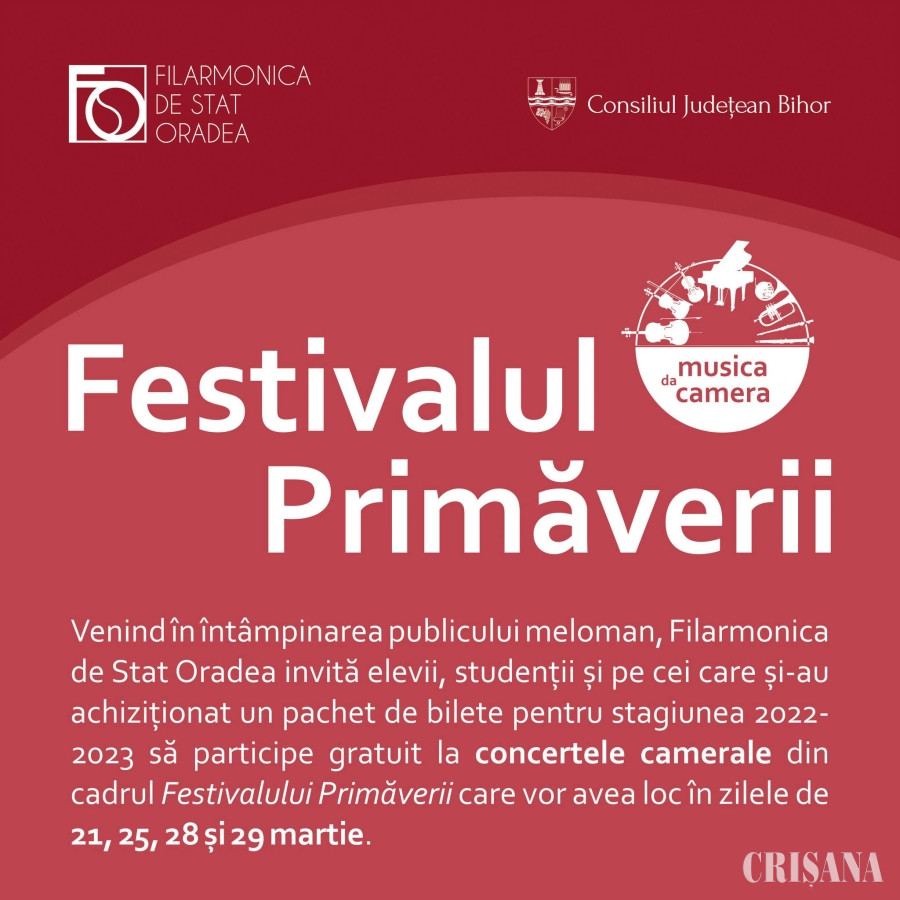 Ediția a XII-a a Festivalului Primăverii se desfășoară la Filarmonica de Stat Oradea, în perioada 21-30 martie, și cuprinde șase serate muzicale, care au loc în sala de concerte Enescu-Bartók.