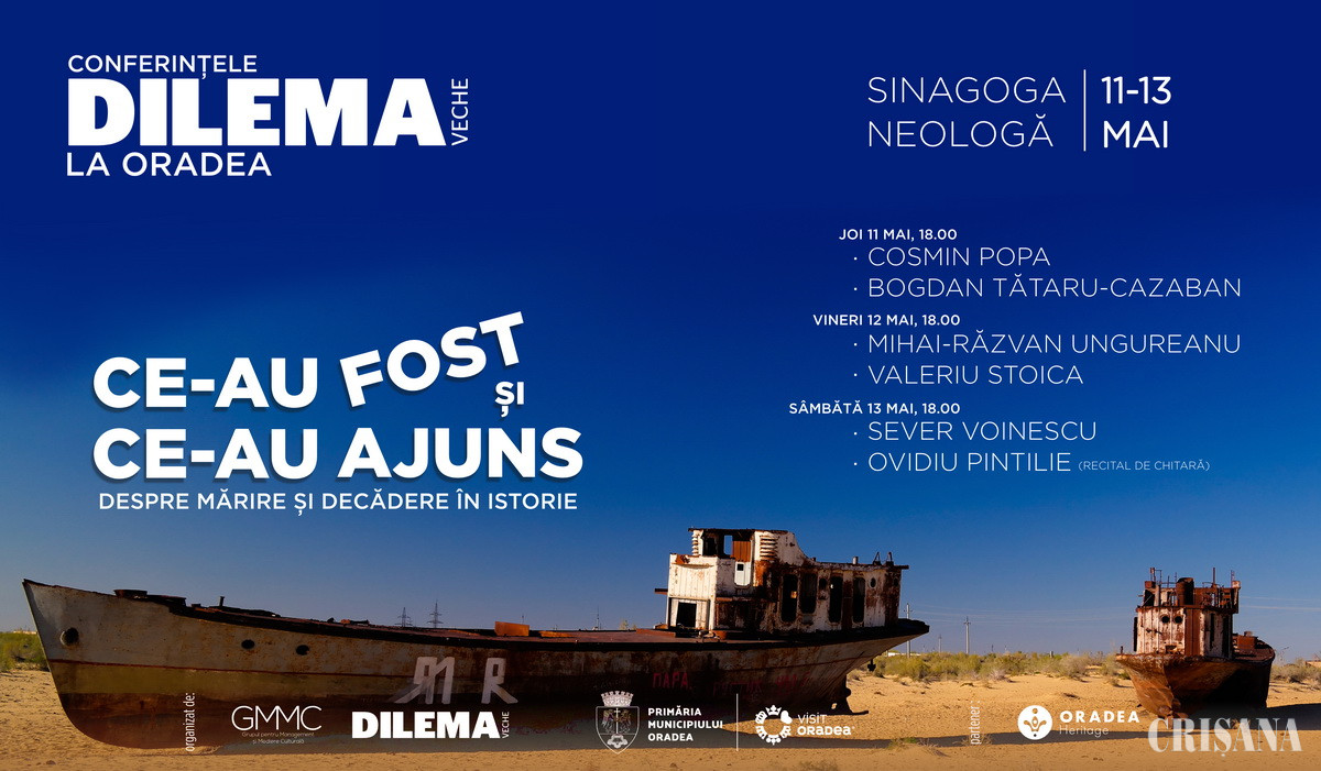 Cea de-a doua ediţie de la Oradea a Conferinţelor Dilema veche se va desfăşura în perioada 11-13 mai, la Sinagoga Neologă Sion, în fiecare zi, de la ora 18.00. Tema acestei ediţii este: „Ce-au fost și ce-au ajuns. Despre mărire și decădere în istorie”.