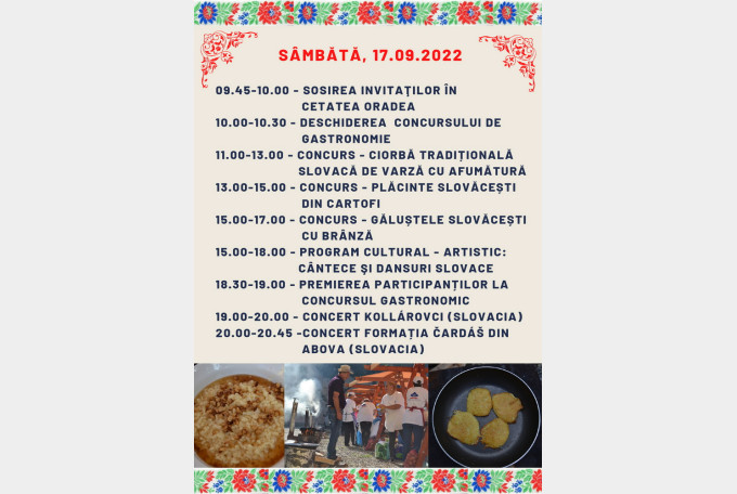 Evenimentul se va desfășura după următorul program: între orele 09.45-10.00 - sosirea invitaților în Cetatea Oradea; orele 10.00-10.30 - deschiderea concursului de gastronomie; orele 11.00-13.00 - concurs de preparat ciorbă tradițională slovacă de varză cu afumătură; orele 13.00-15.00 - concurs de făcut plăcinte slovăcești din cartofi; orele 15.00-17.00 - concurs de făcut găluște slovăcești cu brânză.