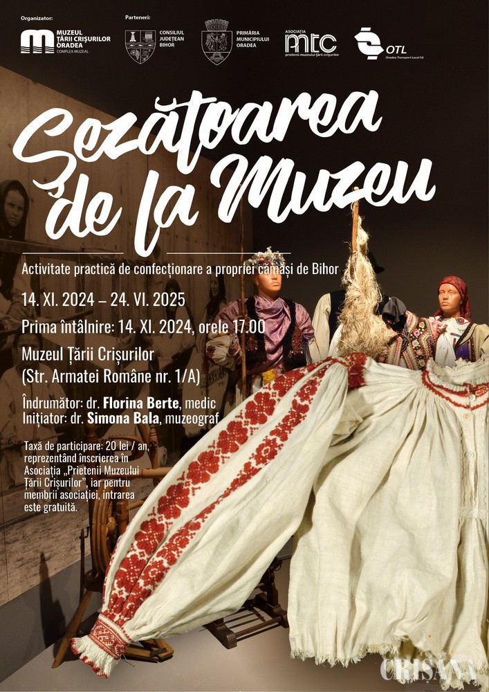 Muzeul Țării Crișurilor Oradea – Complex Muzeal, în parteneriat cu Consiliul Județean Bihor, Primăria Municipiului Oradea, Asociația „Prietenii Muzeului Țării Crișurilor” și OTL SA organizează o nouă „Șezătoare la muzeu”, activitate care se înscrie în proiectul de revitalizare a cămășii vechi românești ce se purta pe meleagurile crișene și la care publicul interesat este invitat să participe. Prima întâlnire va avea loc joi, 14 noiembrie, ora 17.00, în Sala de Pedagogie muzeală.