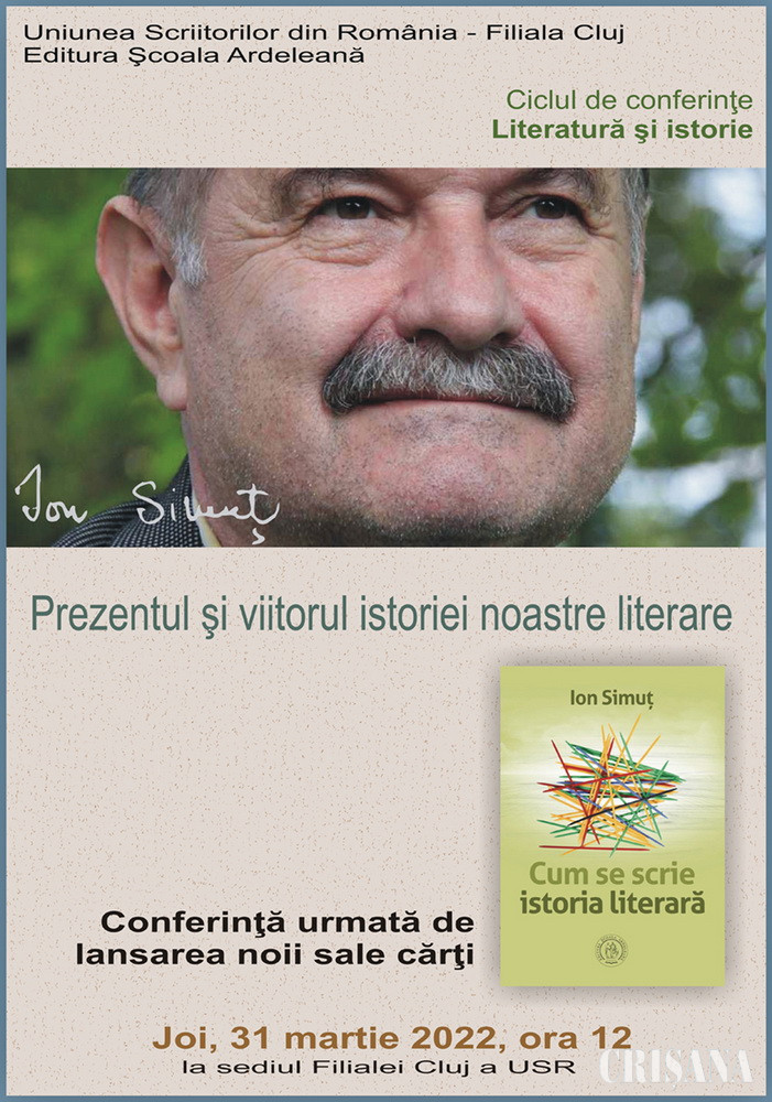 Ion Simuţ va fi prezent joi, 31 martie, la sediul Filialei Cluj a Uniunii Scriitorilor din România. Conferința va fi urmată de lansarea noii sale cărți apărute la Editura Școala Ardeleană: „Cum se scrie istoria literară”.