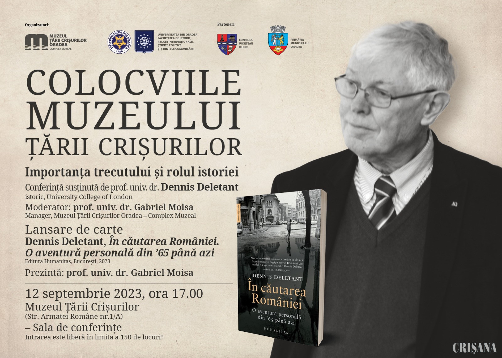 Un nou eveniment de excepție are loc în cadrul Colocviilor Muzeului Țării Crișurilor: conferința „Importanța trecutului și rolul istoriei”, care va fi susținută de prof. univ. dr. Dennis Deletant, University College din Londra, și moderată de prof. univ. dr. Gabriel Moisa, managerul instituției muzeale orădene. Conferința va fi urmată de lansarea cărții „În căutarea României. O aventură personală din ’65 până azi”, autor Dennis Deletant, apărută la Editura Humanitas, București, 2023, care va fi prezentată de prof. univ. dr. Gabriel Moisa.