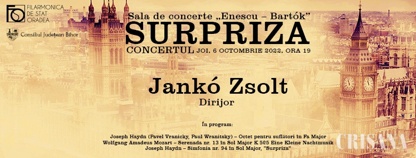 Melomanii orădeni sunt invitați joi, 6 octombrie, de la ora 19.00, în sala Enescu – Bartok a Filarmonicii, la un concert simfonic, „Surpriză”, avându-l la pupitrul dirijoral pe maestrul Jankó Zsolt.