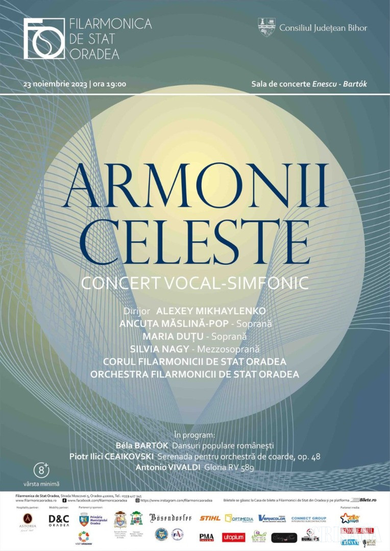 Melomanii orădeni sunt invitați la concertul vocal-simfonic „Armonii celeste”, al Filarmonicii de Stat Oradea, care va avea loc joi, 23 noiembrie, de la ora 19.00, în sala de concerte „Enescu - Bartók”.