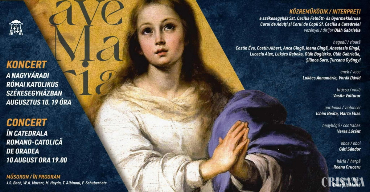 Iubitorii muzicii clasice și sacre sunt așteptați duminică, 10 august, la ora 19.00, la Catedrala Romano-Catolică din Oradea la un concert Ave Maria, ca pregătire pentru hramul bisericii.