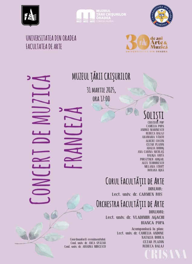 Studenții Facultății de Arte din Oradea vor susține luni, 31 martie, de la ora 17.00, un concert dedicat primăverii, cu piese semnate de mari compozitori francezi. Evenimentul face parte din seria aniversară „30 de Ani Arte și Muzică” și oferă publicului ocazia de a vizita gratuit o secție a muzeului.