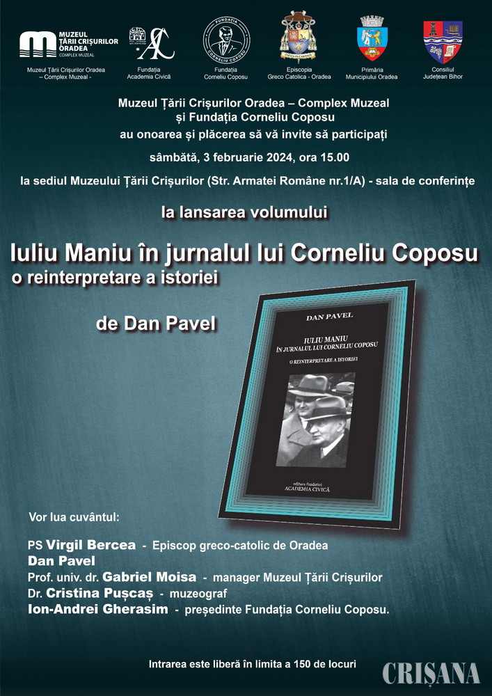 La Muzeul Țării Crișurilor Oradea – Complex Muzeal, sâmbătă, 3 februarie, de la ora 15.00, va avea loc lansarea volumului „Iuliu Maniu, în jurnalul lui Corneliu Coposu. O reinterpretare a istoriei”, autor Dan Pavel. Cartea a văzut lumina tiparului în decembrie 2023, la Editura Fundației „Academia Civică”.