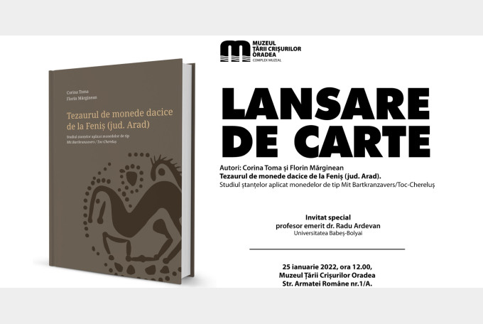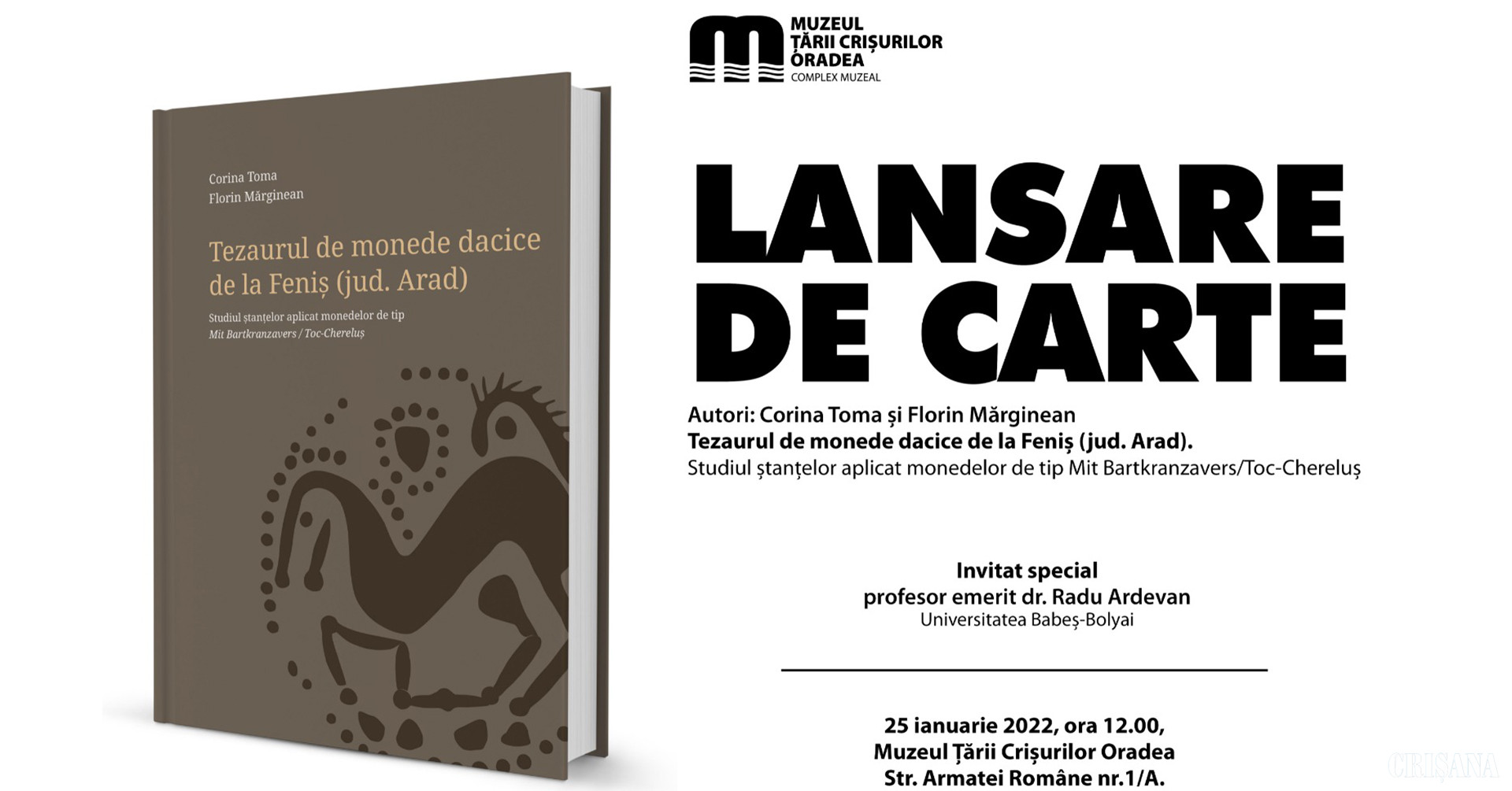 Muzeul Țării Crișurilor va organiza marţi, 25 ianuarie, un eveniment de lansare a volumului „Tezaurul de monede dacice de la Feniș (jud. Arad). Studiul ștanțelor aplicat monedelor de tip Mit Bartkranzavers/Toc-Chereluș”. Co-autor al cărţii de studii este numismatul MTC Corina Toma.
