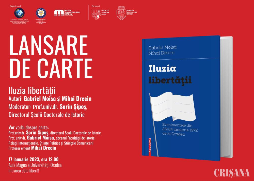 Facultatea de Istorie, Relații Internaționale, Științe Politice și Științele Comunicării din cadrul Universității din Oradea și Școala Doctorală de Istorie a Universității din Oradea organizează împreună cu Muzeul Țării Crișurilor Oradea - Complex Muzeal și în parteneriat cu Consiliul Județean Bihor și Primăria Municipiului Oradea, lansarea cărții Iluzia libertății, ce poartă semnătura istoricilor Gabriel Moisa și Mihai Drecin.