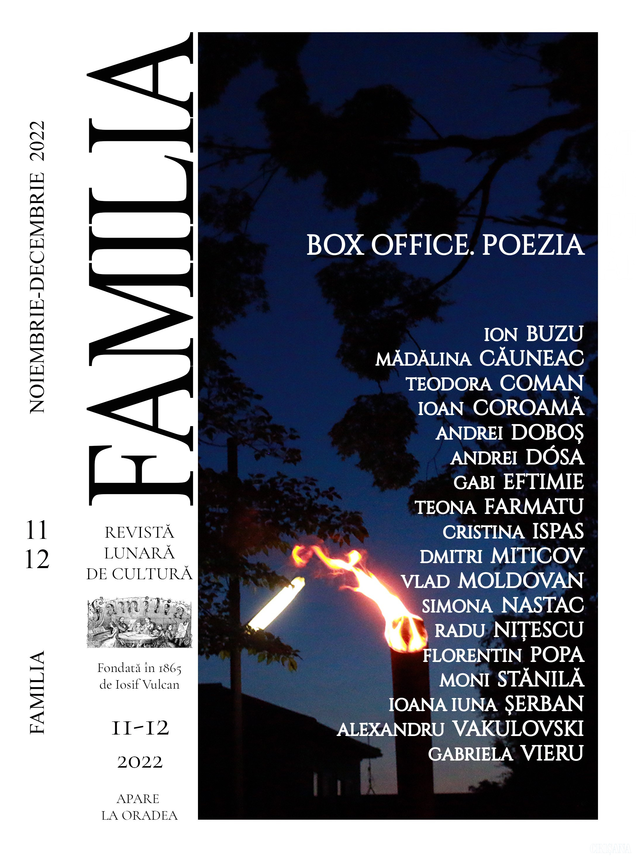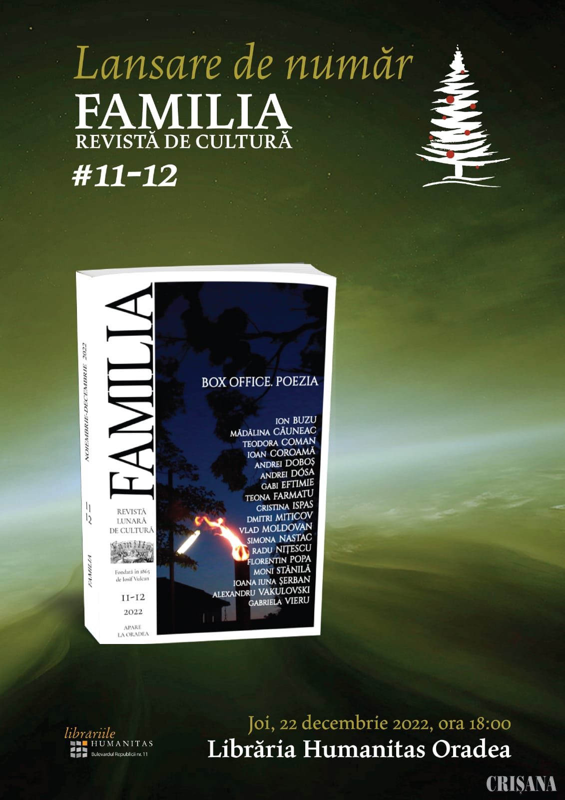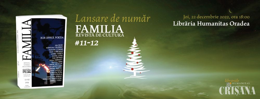 În toiul pregătirilor de Crăciun, Revista de Cultură „Familia” invită orădenii la o seară de revigorare poetică. Joi, 22 decembrie, începând cu ora 18.00, cititorii sunt așteptați la Librăria Humanitas Oradea pentru a sărbători, prin lansarea numărului 11-12, împlinirea unui nou an publicistic îmbelșugat.