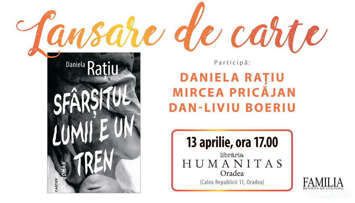 Editura Cartier și revista „Familia” vă invită, sâmbătă, 13 aprilie, la ora 17.00, la o întâlnire cu scriitoarea Daniela Rațiu, prilejuită de romanul său răvășitor „Sfârșitul lumii e un tren”, proaspăt apărut la Editura Cartier. Cartea invocă foametea de după cel de-al Doilea Război Mondial. Alături de autoare, participă la dialog Dan-Liviu Boeriu și Mircea Pricăjan.