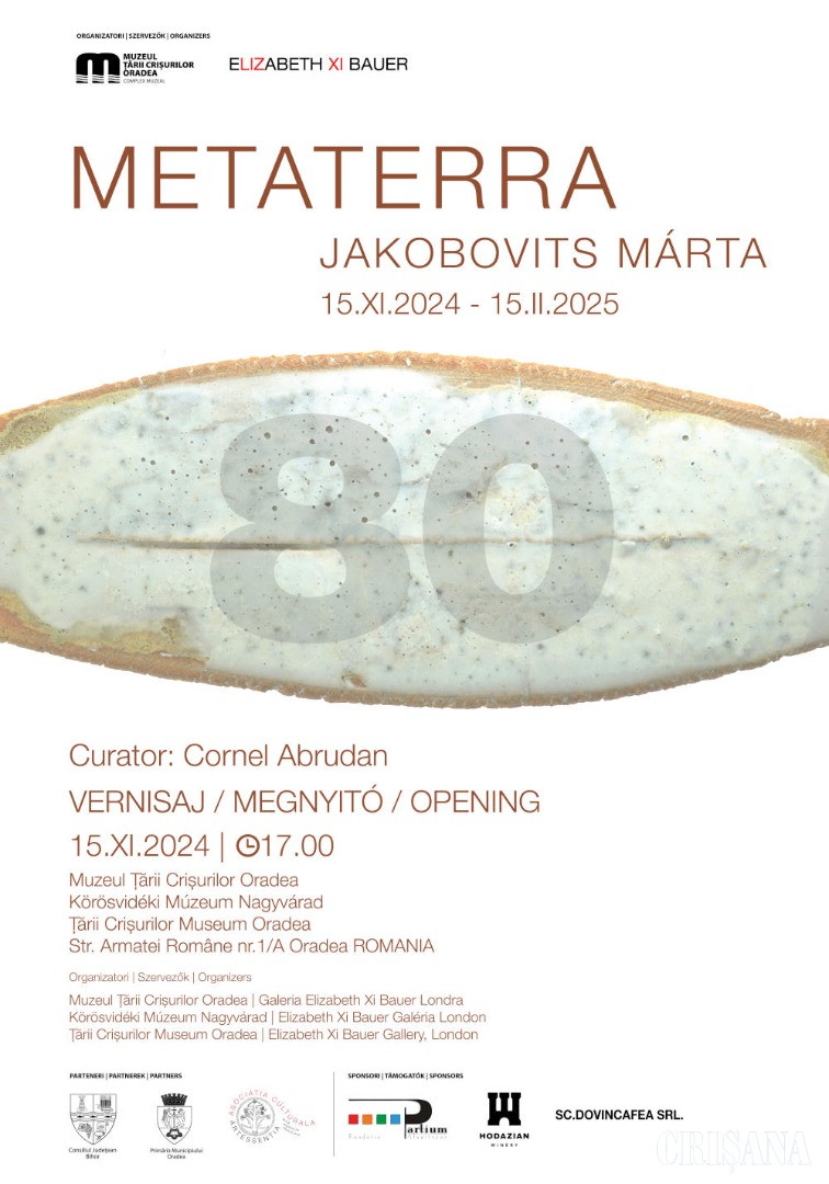 În sala de expoziții temporare a Muzeului Țării Crișurilor, vineri, 15 noiembrie, de la ora 17.00, va avea loc vernisajul expoziției retrospective „MetaTerra”, a ceramistei Marta Jakobovits.