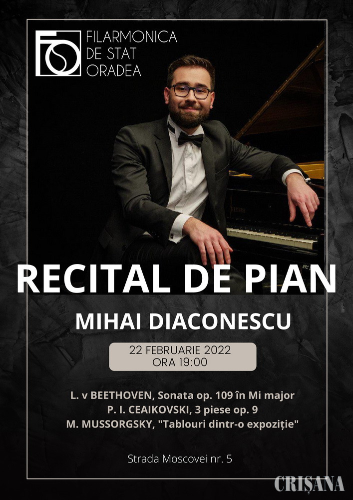 Filarmonica de Stat Oradea deschide sezonul recitalurilor cu un eveniment învăluit de sentimentul iubirii, exprimat prin lucrări compuse de Ludwig van Beethoven, Piotr Ilici Ceaikovski și Modest Mussorgsky. Recitalul va fi susținut de pianistul Mihai Diaconescu la Sala Enescu-Bartók, marți în data de 22 februarie, la ora 19.00.