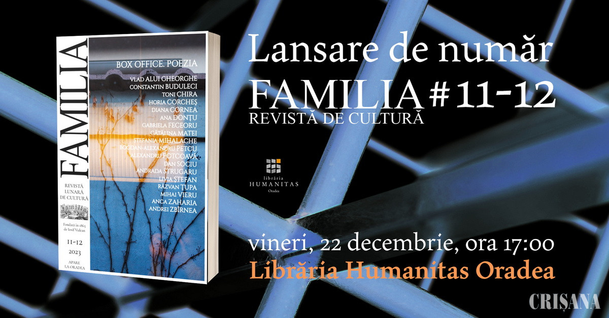 Redacția Revistei de cultură „Familia” invită orădenii la o nouă lansare de număr, care va avea loc vineri, 22 decembrie, începând cu ora 17.00, la Librăria Humanitas (str. Republicii nr. 11).