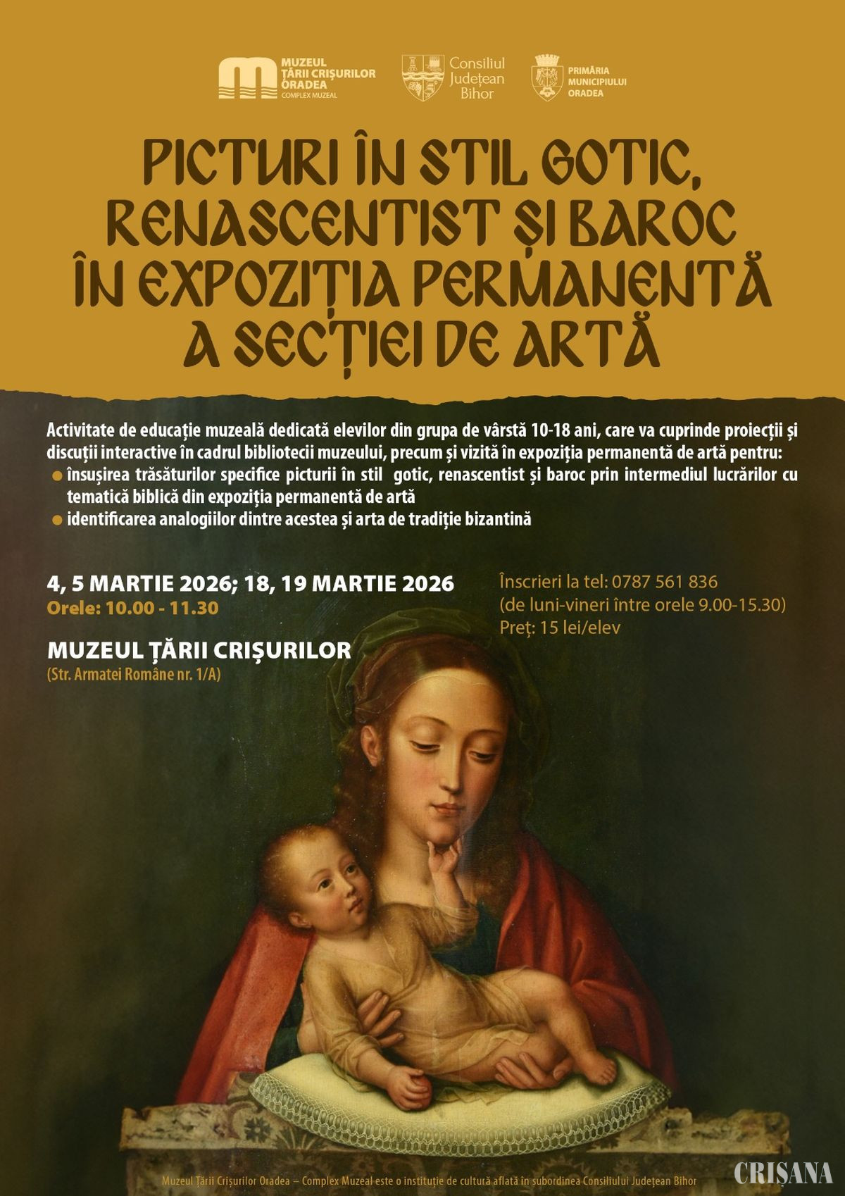 Sub genericul „Picturi în stil gotic, renascentist și baroc în Expoziția permanentă a Secției de Artă”, începând din 4 martie, la Oradea, va avea loc o inedită activitate de educație muzeală.