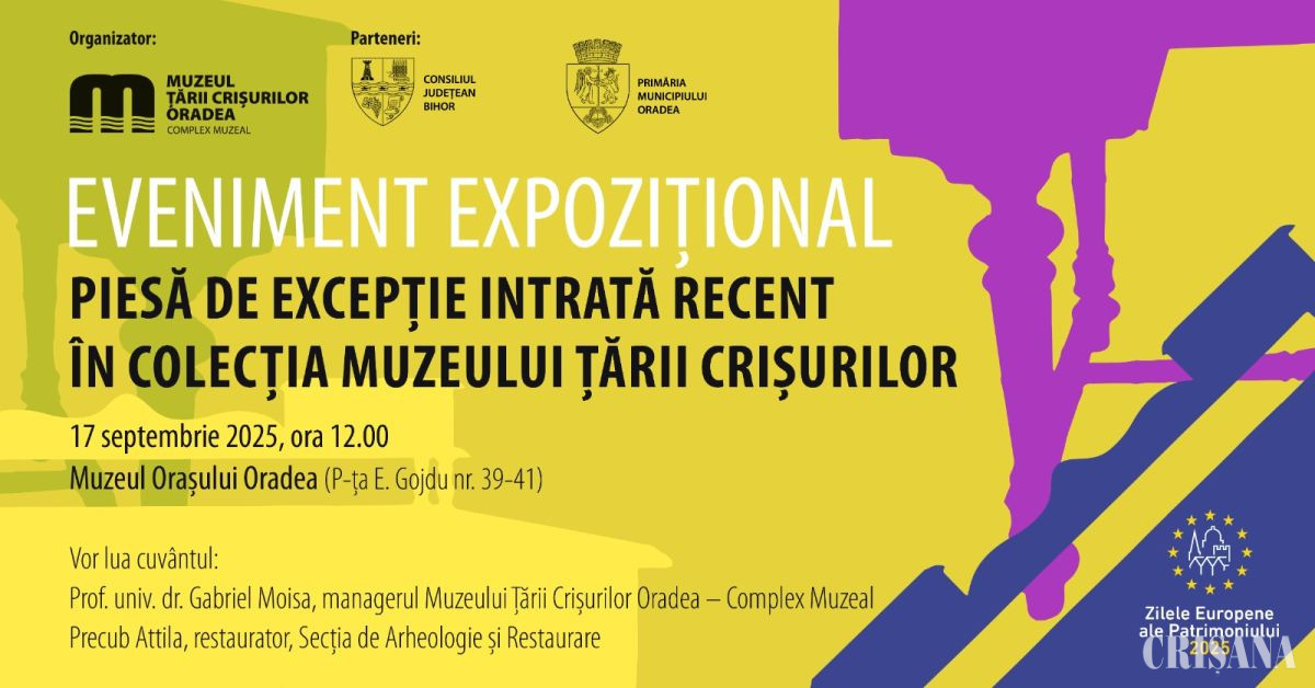 Intrată recent în colecția instituției muzeale, pentru această piesă s-au demarat deja procedurile de clasare în categoria Tezaur. Ea a fost în prealabil supusă unor lucrări de restaurare efectuate de personalul de specialitate al Muzeului Țării Crișurilor. Piesa va fi expusă în premieră, miercuri, 17 septembrie, la Muzeul Orașului Oradea (P-ța E. Gojdu nr. 39-41), într-un cadru festiv, cu începere de la ora 12.00. Atât exponatul în sine, cât și proprietarul colecției de proveniență a acestuia vor fi surpriza rezervată publicului și presei, invitați la eveniment.