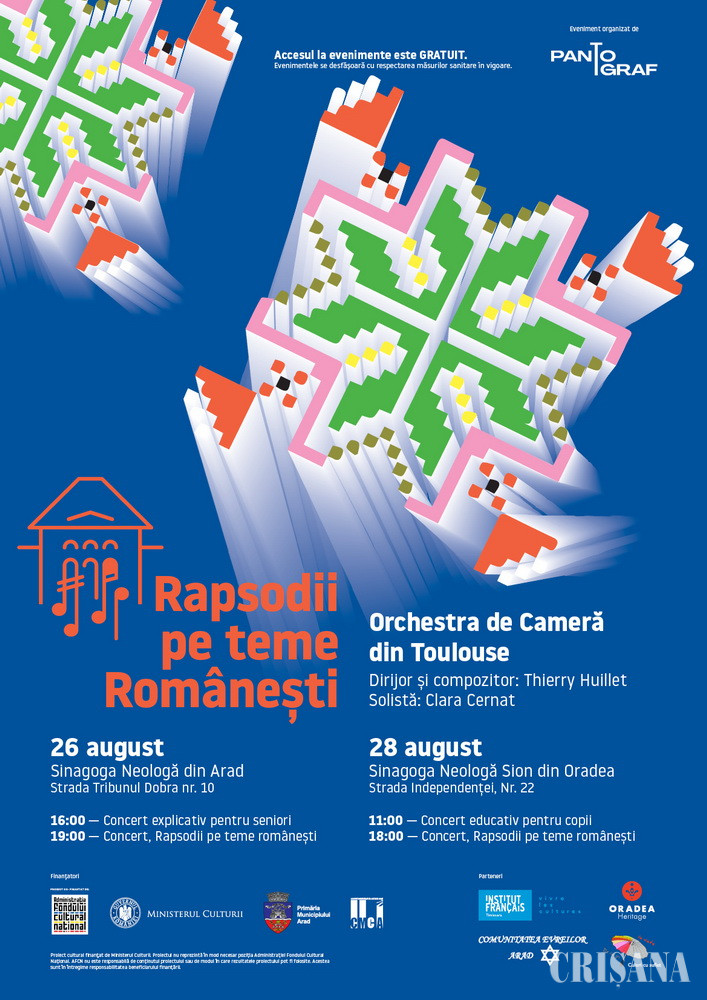 Concertul „Rapsodii pe teme românești pentru vioară și orchestră” va avea loc în data de 28 august, la Sinagoga Neologă Sion (strada Independenței, nr. 22), de la ora 18.00.