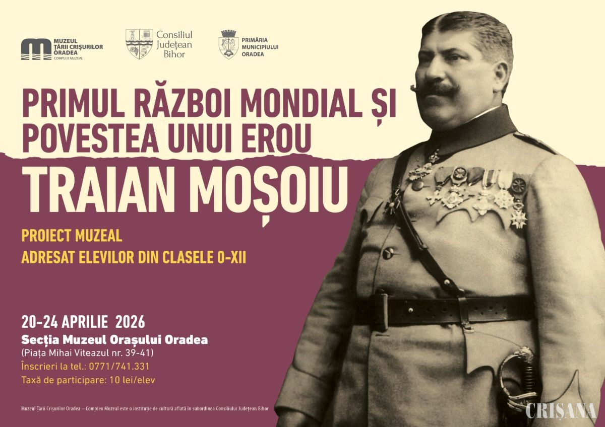 Muzeul Țării Crișurilor Oradea – Complex Muzeal organizează, împreună cu Consiliul Județean Bihor și Primăria Municipiului Oradea, activitatea de educație muzeală, intitulată „Primul Război Mondial și Povestea unui Erou – Traian Moșoiu”. Aceasta va avea loc în perioada 20-24 aprilie, la Secția Muzeul Orașului Oradea (Piața Mihai Viteazul nr. 39-41), și este adresată elevilor din clasele 0-XII. În cadrul întâlnirii cu elevii, vor fi prezentate aspecte privind Primul Război Mondial, personalitatea generalului Traian Moșoiu și eliberarea orașului Oradea în 20 aprilie 1919.