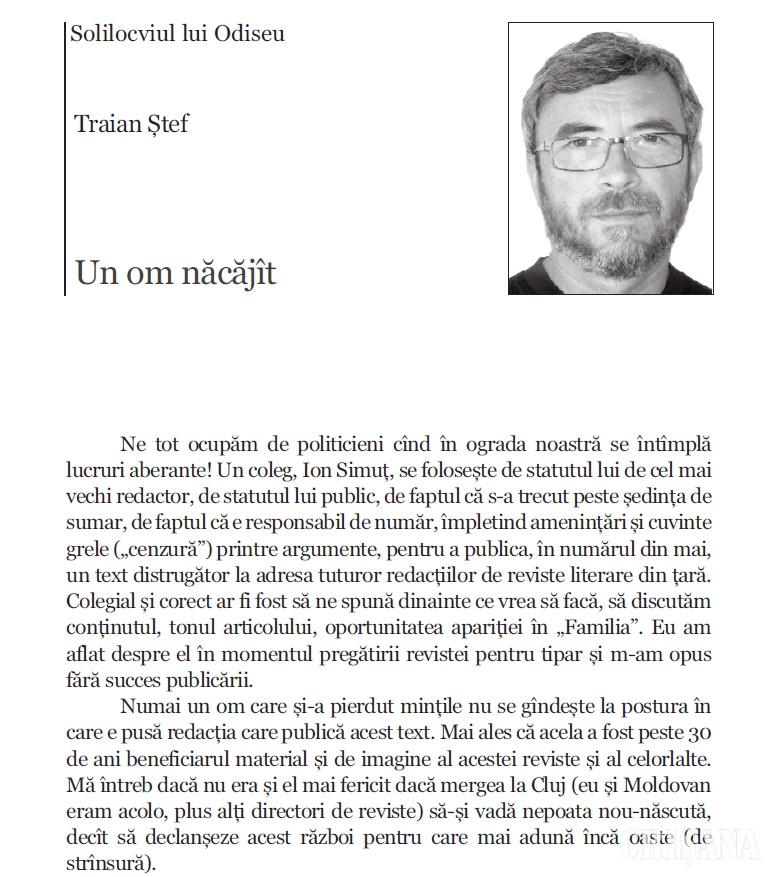 În virtutea dreptului la replică, vă rog să publicați articolul care urmează, ca răspuns la textul colegului nostru Traian Ștef, Un om năcăjît, publicat în revista „Familia”, nr. 6, iunie 2019, p. 17-19. Ca redactori la revista „Familia”, noi suntem, totuși, înainte de toate, jurnaliști și ar fi normal să respectăm deontologia profesiei. Anterior, mi-a fost refuzată o altă versiune a dreptului la replică, pe motiv că s-a extins și asupra altor opinii, care nu apăruseră în revista „Familia”. Propun un text reconfigurat, cu un sentiment stânjenitor, ca un efect al onestității terfelite la mine acasă, la noi acasă, ofensă ce mi-a fost adusă de un coleg indiferent la civilitatea dialogului. Regret unele note mai tari ale răspunsului, la care m-a obligat agresivitatea cuiva fără simțul măsurii. Nu am putut fi mai scurt, pentru că explicațiile, și așa comprimate, sunt inevitabil mai lungi decât zgomotele acuzelor iresponsabile, bazate pe presupuneri și judecăți neîntemeiate. Cu alte cuvinte, Traian Ștef mă îndeamnă, ca în anii 1950, să-mi scriu autobiografia. Nu am s-o fac, dar defăimarea și calomniile trebuie arătate.