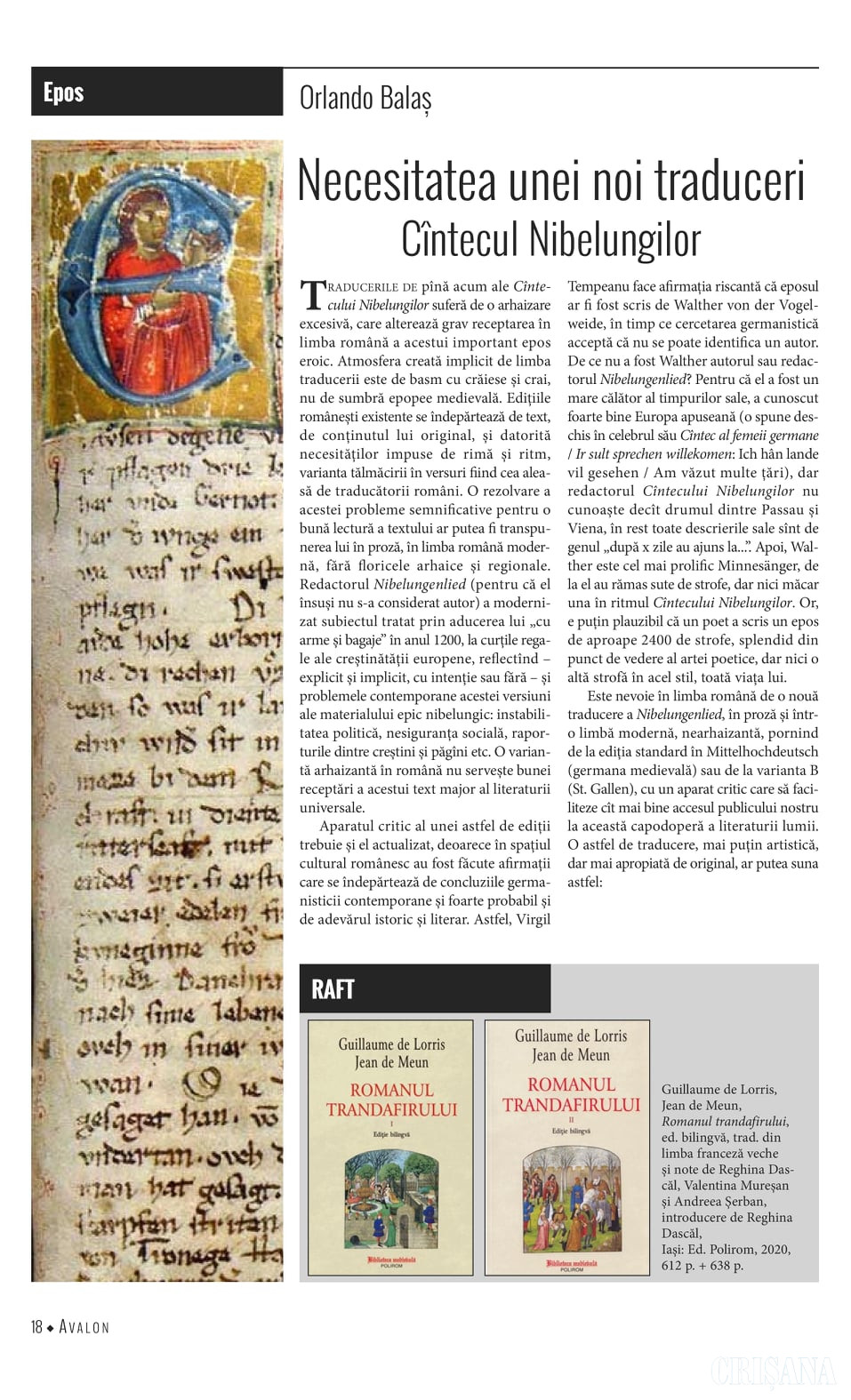 „Tocmai mi s-a făcut o onoare imensă. Revista de cultură Avalon, coordonată de profesorul Ovidiu Pecican, mi-a publicat, în cea mai recentă ediție, o traducere a primelor două Aventiure ale Cîntecului Nibelungilor (din Mittelhochdeutsch în neoromână) și un grupaj de versuri, care desigur nu sînt literatură, pentru că sînt tematice, adică pro-natura”, anunță Orlando Balaș, pe pagina sa de Facebook. Scriitorul consideră că în limba română este nevoie de o nouă traducere a „Nibelungenlied”, în proză și într-o limbă modernă, nearhaizantă, pornind de la ediția standard în Mittelhochdeutsch sau de la varianta B (St. Gallen), cu un aparat critic care să faciliteze cât mai bine accesul publicului de limbă română la această capodoperă a literaturii române.