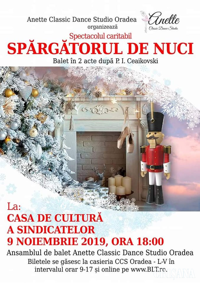 Casa de Cultură a Sindicatelor din Oradea va găzdui în data de 9 noiembrie, de la ora 18.00, spectacolul de balet „Spărgătorul de Nuci”, după P.I. Ceaikovski. Din distribuție fac parte peste 40 de copii și adulți, cu vârste cuprinse între 4 și 45 de ani.
