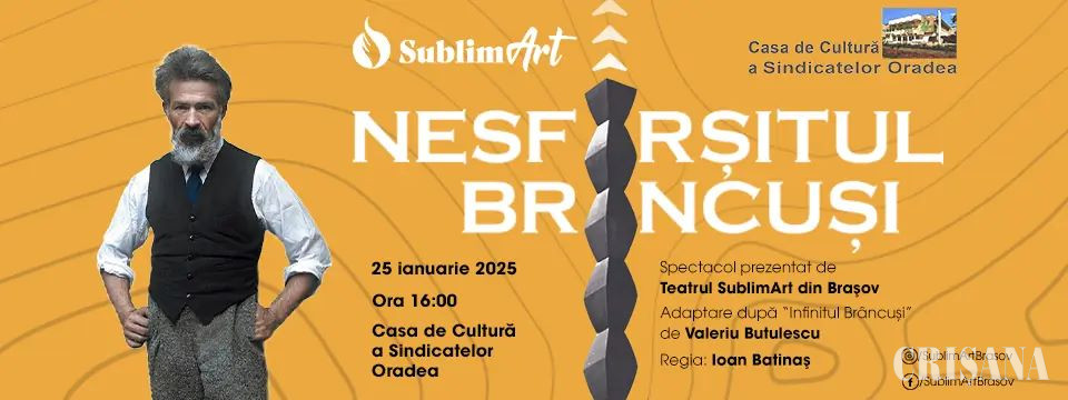 Casa de Cultură a Sindicatelor Oradea va găzdui sâmbătă, 25 ianuarie, de la ora 16.00, spectacolul de teatru „Nesfâșitul Brâncuși”, adaptare după „Infinitul Brâncuși”, de Valeriu Butulescu, în regia lui Ioan Batinaș.