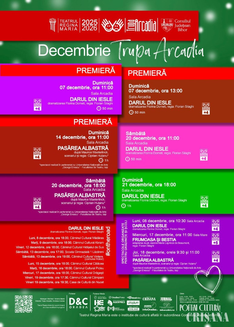 În ultima lună a anului, Trupa Arcadia vă invită să trăiți pe scenă cea mai frumoasă poveste a Crăciunului, în spectacolul „Darul din Iesle”, dramatizare de Florina Dometi, în regia lui Florian Silaghi. Reprezentațiile spectacolelor se joacă: duminică, 7 decembrie, de la orele 11.00 și 13.00, la Sala Arcadia; sâmbătă, 20 decembrie, de la ora 11.00, la Sala Arcadia; duminică, 21 decembrie, de la ora 18.00, la Sala Arcadia; duminică, 14 decembrie, de la ora 11.00, și sâmbătă, 20 decembrie, de la ora 18.00, sunteți așteptați la la cea mai nouă premieră a Trupei Arcadia, despre căutarea fericirii perfecte în „Pasărea Albastră”, scenariu și regie de Ciprian Huțanu, după Maurice Maeterlinck.