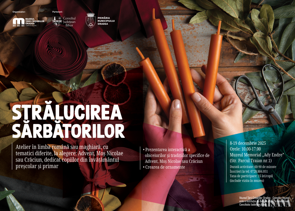 Muzeul Țării Crișurilor Oradea – Complex Muzeal organizează, în parteneriat cu Consiliul Județean Bihor și Primăria Municipiului Oradea, atelierul de creație „Strălucirea sărbătorilor”, cu tematici diferite, la alegere: Advent, Moș Nicolae sau Crăciun.