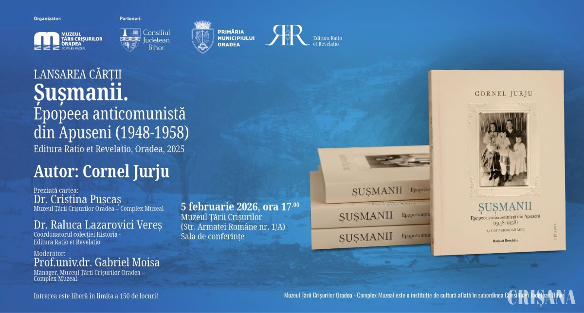 În Sala de conferințe a Muzeului Țării Crișurilor, joi, 5 februarie, de la ora 17.00, va avea loc evenimentul de lansare a cărții „Șușmanii. Epopeea anticomunistă din Apuseni (1948-1958)”, autor Cornel Jurju.