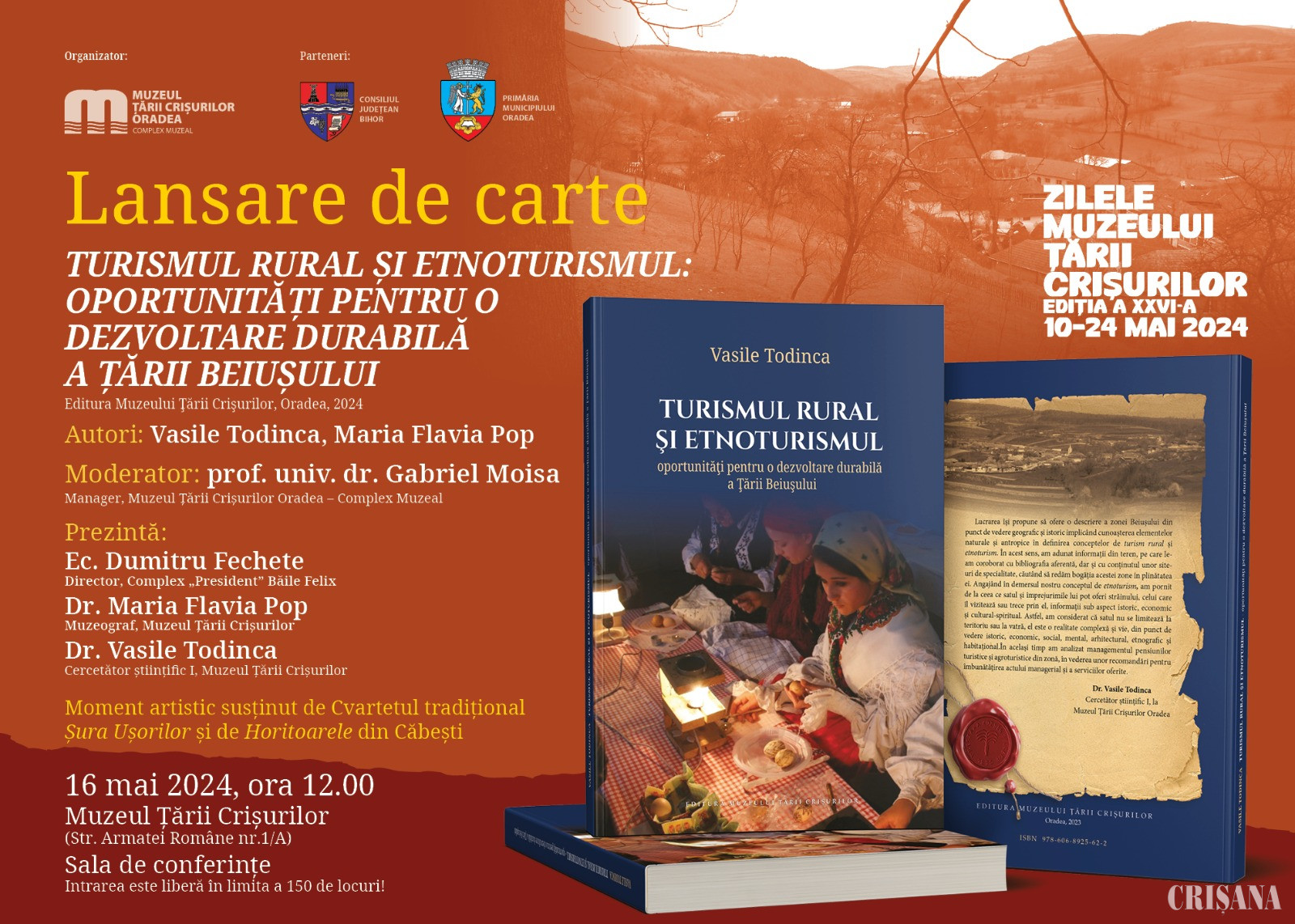 Muzeul Țării Crișurilor Oradea organizează lansarea volumului „Turismul rural și etnoturismul: oportunități pentru o dezvoltare durabilă a Țării Beiușului”.