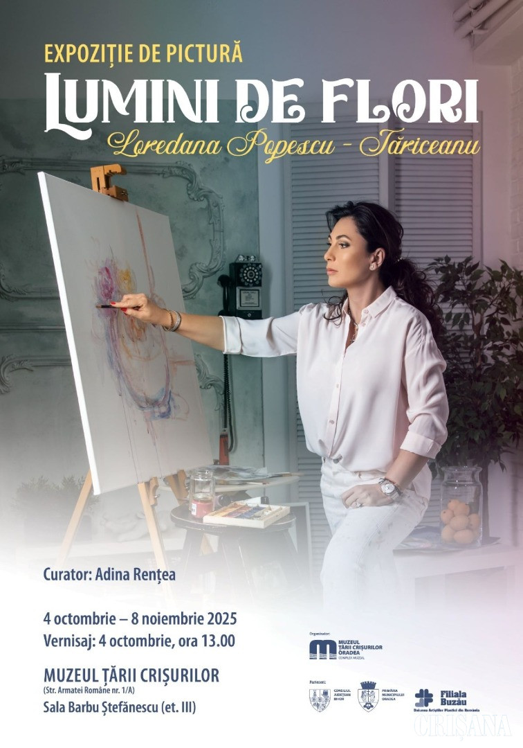 La sediul Muzeului Țării Crișurilor, sâmbătă, 4 octombrie, de la ora 13.00, va avea loc vernisajul expoziției de pictură „Lumini de flori”, semnată de Loredana Popescu-Tăriceanu.