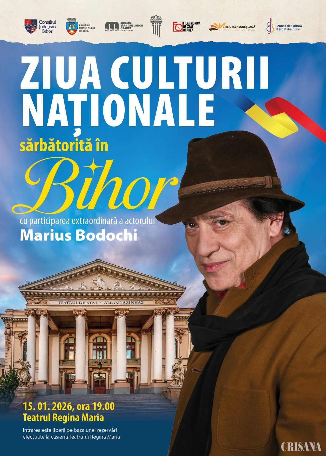Ziua Culturii Naționale va fi marcată în acest an printr-un spectacol extraordinar susținut de actorul Marius Bodochi. Evenimentul va avea loc la Teatrul de Stat „Regina Maria” din Oradea, joi, 15 ianuarie, ora 19.00. Accesul la eveniment este gratuit, în baza unui bilet care se poate rezerva la casieria teatrului.