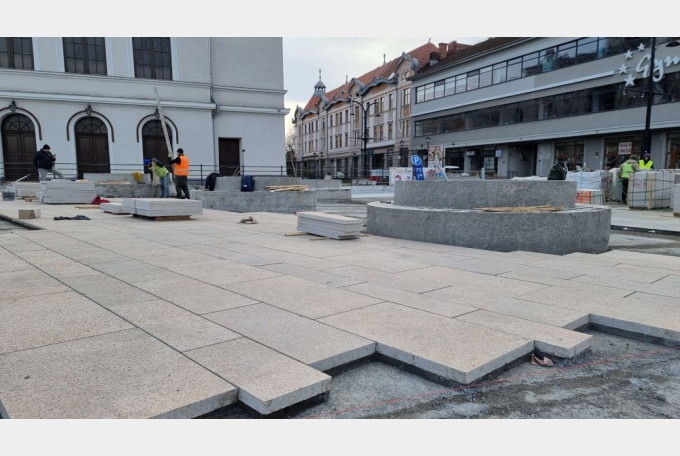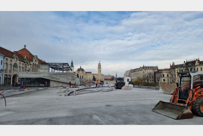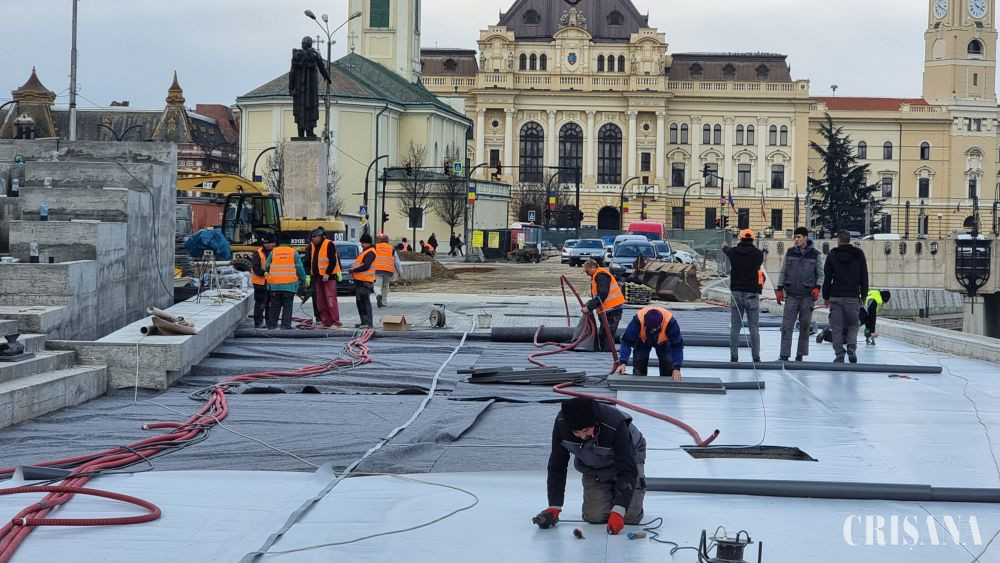 „În aceste zile au început lucrările de pavare a piațetei, pe o suprafață de peste 7500 mp, pavajul realizându-se din piatră naturală din granit auriu și cubeți de porfir. Stadiul fizic al lucrărilor totale este de 35%. Până în momentul de față, au fost efectuate lucrări de demolare, lucrări la structurile de rezistență a celor trei corpuri de clădire, s-au realizat lucrări la structurile de rezistență a esplanadei și zonelor de promenadă, lucrări de hidroizolare. De asemenea, s-au executat lucrări de instalații de preluare a apelor pluviale, s-au efectuat lucrări de instalații sanitare - oglinda apei, lucrări de instalații fântâni arteziene, lucrări de instalații HVAC, s-au executat lucrări de instalații electrice exterioare, precum și de instalații electrice și sanitare interioare la corpurile de clădire, împreună cu lucrări de placare cu pavaj de piatră naturală din granit auriu”, se arată într-un comunicat al Primăriei Oradea.