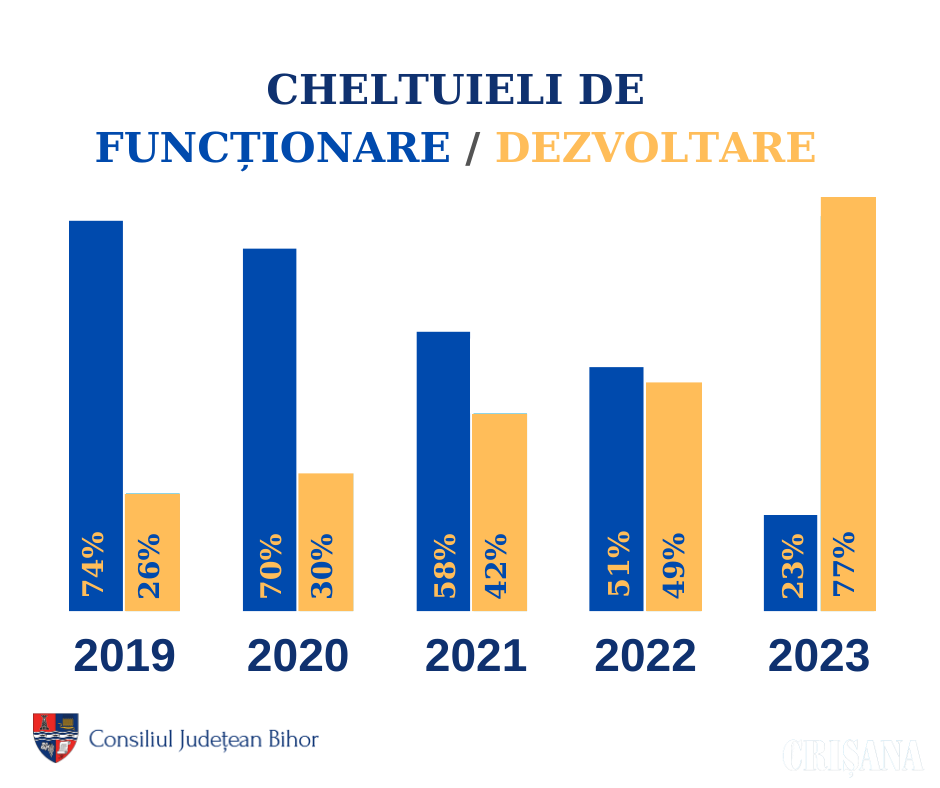 În 2023, bugetul de dezvoltare a fost de 1,13 miliarde de lei, iar cel de funcționare, de 341 de milioane de lei. Comparativ, în anii precedenţi, fondurile pentru investiţii ale CJ Bihor au fost mult mai mici: 69 milioane lei în 2017, 39 milioane lei în 2018, 114 milioane lei în 2019 (26% din bugetul CJ), 147 milioane lei în 2020 (30% din buget), 197 milioane lei în 2021 (42% din buget), 288 milioane lei în 2022 49% din buget). Graficul investițiilor derulate arată o creștere semnificativă începând cu anul 2021. Acest rezultat este o consecință a fondurilor europene atrase, a finanțărilor guvernamentale și a resurselor proprii ale Consiliului Județean Bihor.
