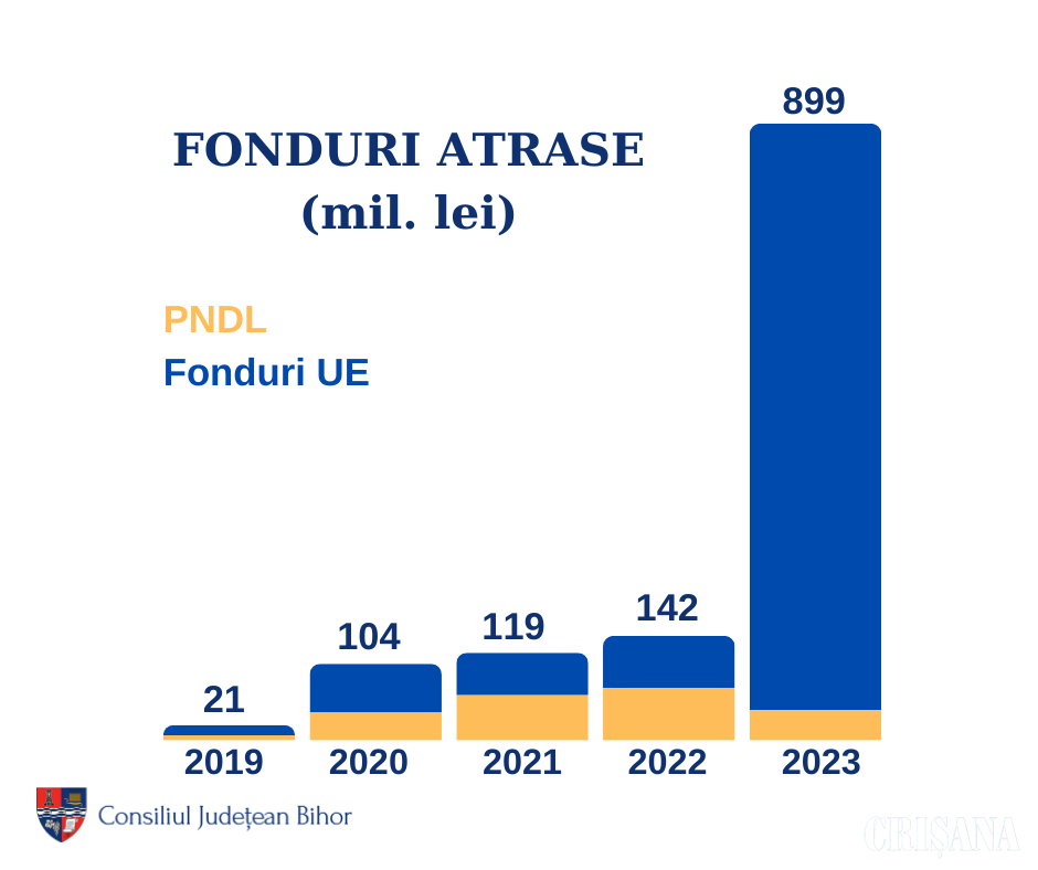 „Accesarea fondurilor europene și valorificarea oportunităților de dezvoltare a devenit o prioritate pentru Consiliul Județean Bihor după 2020. În paralel cu derularea proiectelor câștigate în exercițiul financiar 2014-2020, au fost pregătite noi proiecte (ex. rețeaua de centuri, pasaje și parcuri industriale), s-au realizat parteneriate cu alte autorități, au fost deblocate proiecte. S-au fructificat toate posibilitățile de a atrage fonduri și dezvoltare în județul nostru. După 2 ani, în 2023, se văd rezultatele: aproape 900 de milioane lei fonduri atrase. Având în vedere contractele ce urmează să fie semnate și în acest an, cel puțin în următorii 2-3 ani sumele atrase din fonduri europene se vor menține la un nivel la fel de mare ca anul trecut”, a adăugat președintele CJ Bihor.