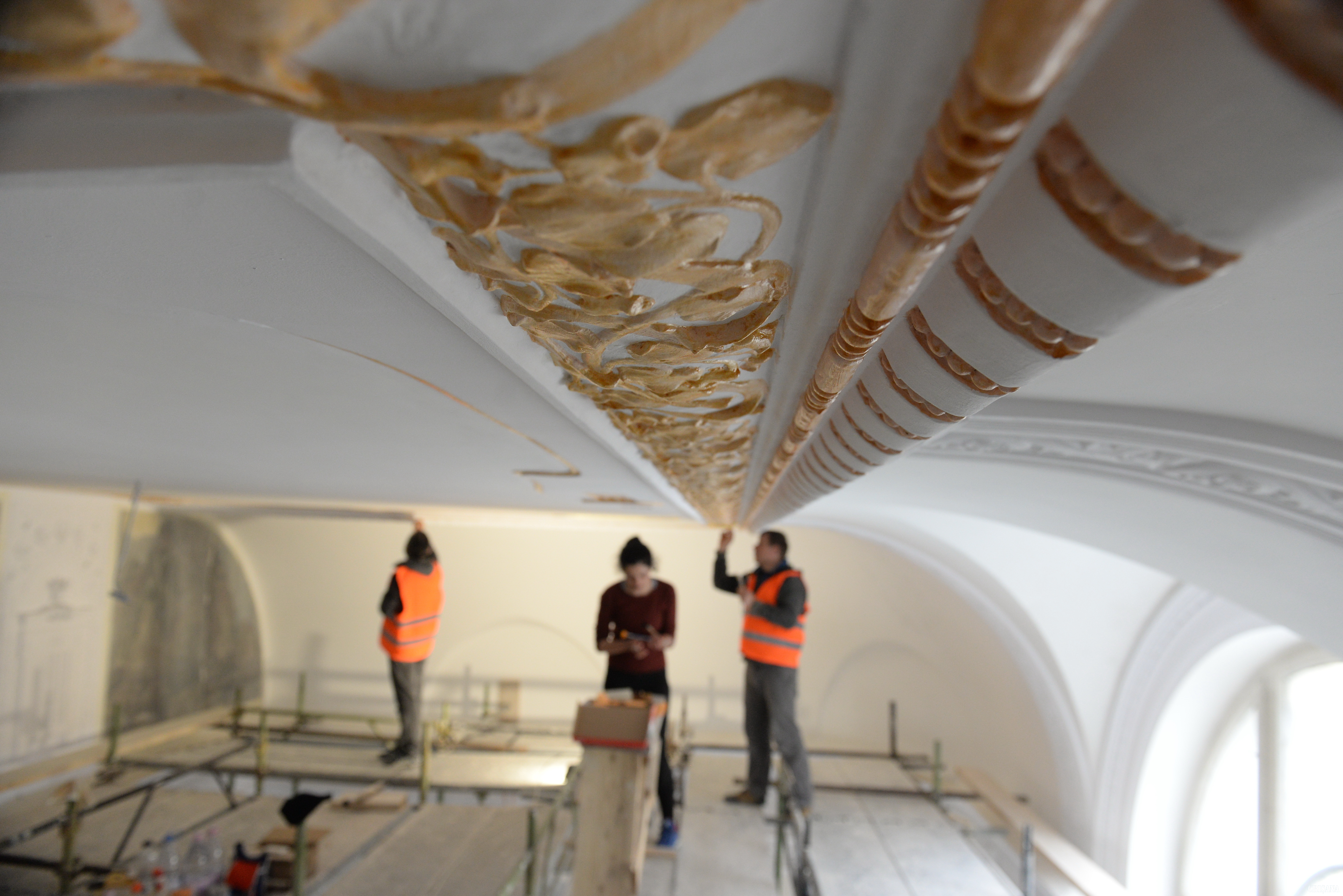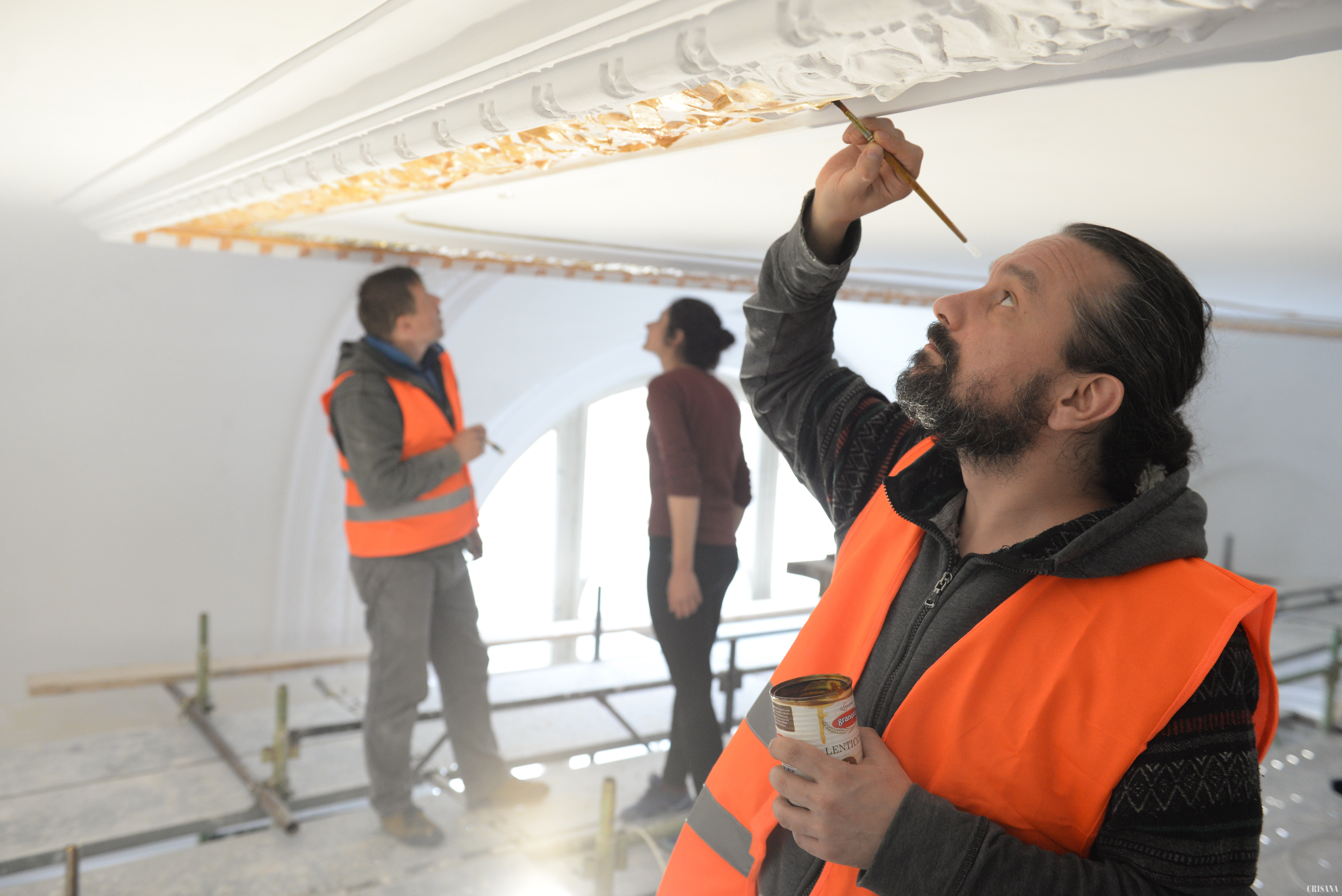 Lucrările de reabilitare din interiorul Primăriei Oradea - Foiţe de aur pe ornamente