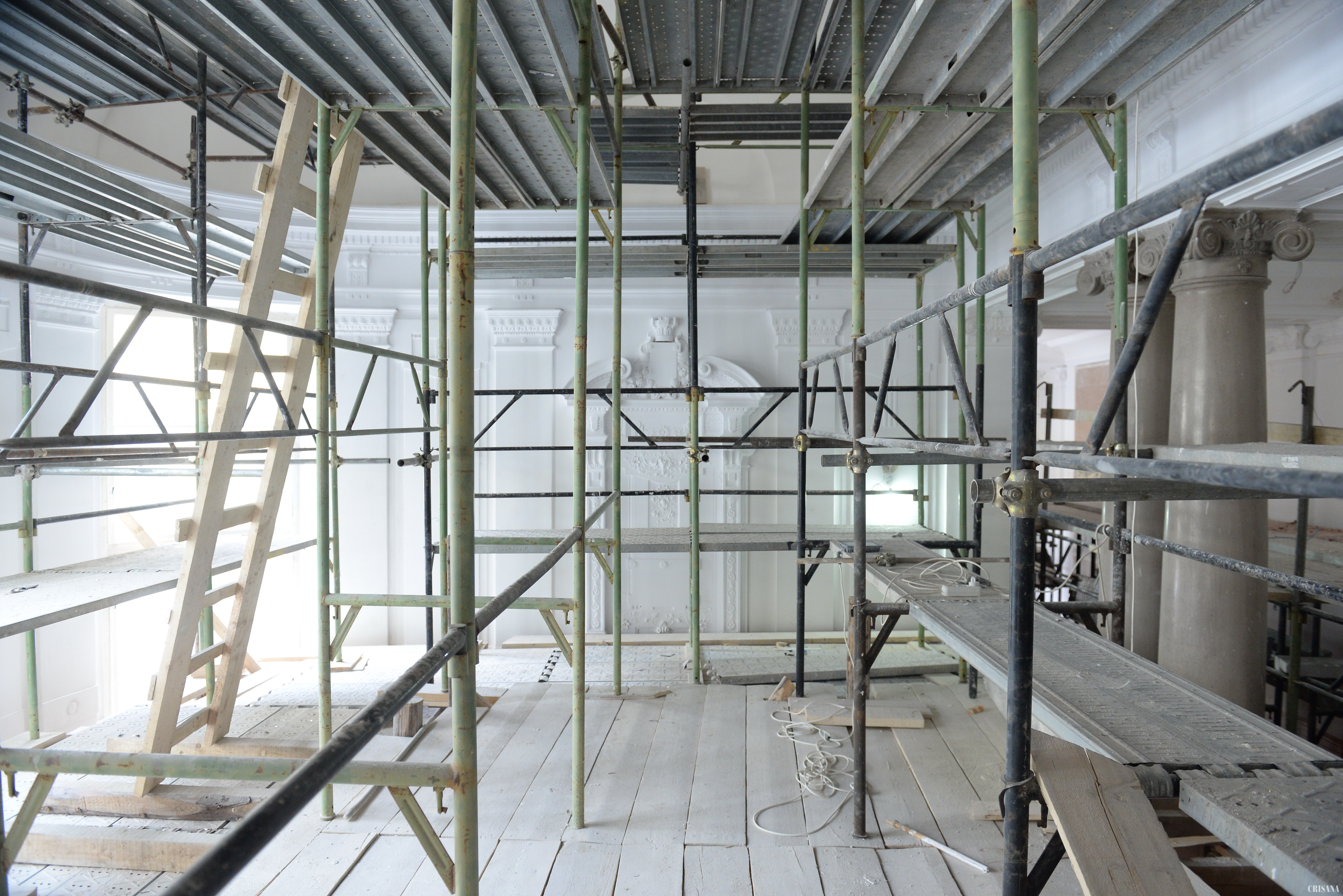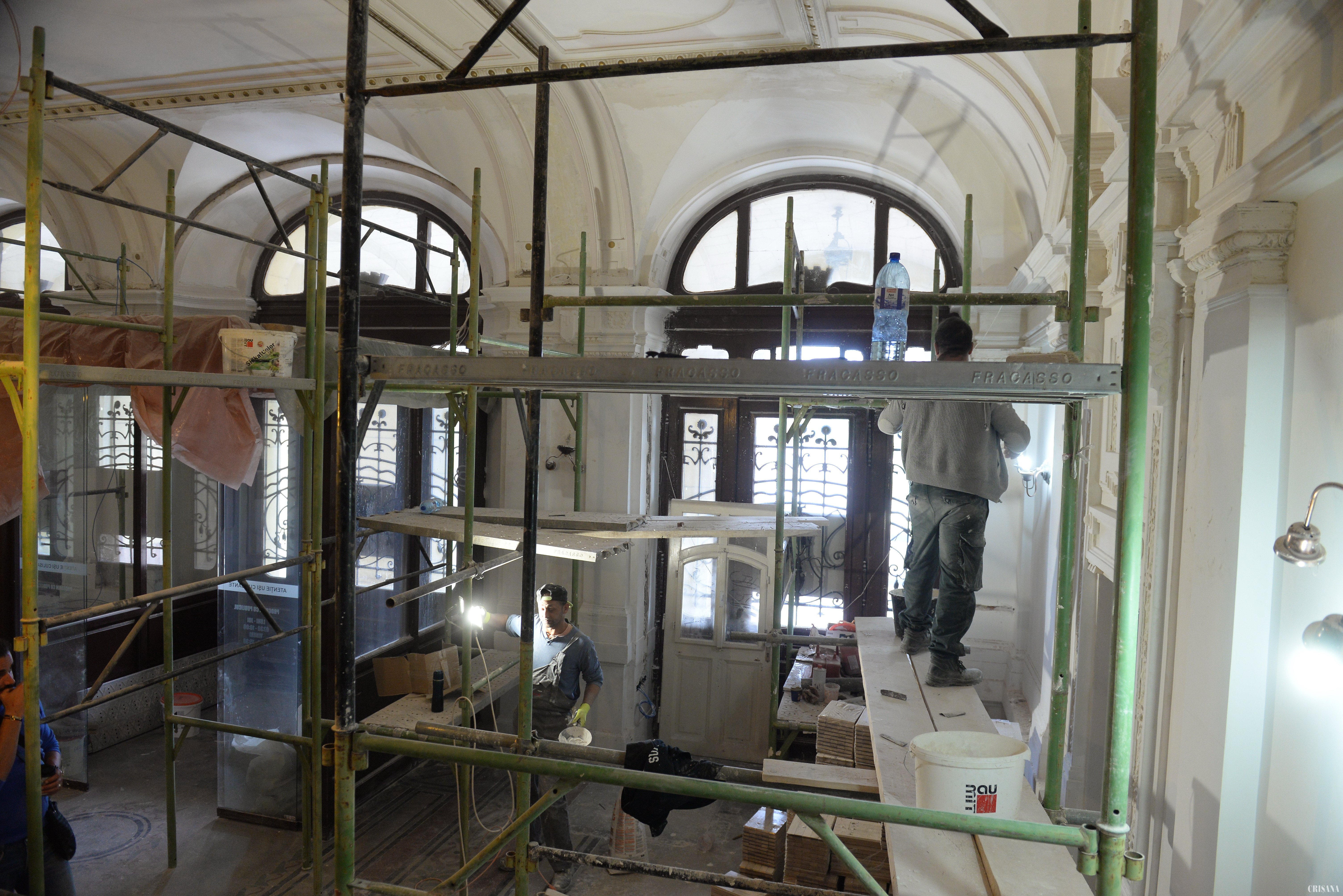 În prezent, muncitorii lucrează în holul principal de acces, în holul de la etajul I și pe casa scărilor, unde ornamentele proaspăt refăcute sunt finisate cu foiță de aur. Constructorul estimează că această parte va fi gata până în luna iulie.