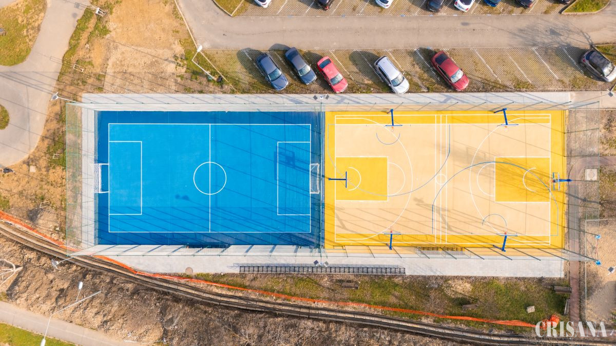 Aici au fost amenajate două terenuri: un teren de sport multifuncțional, cu dimensiunile de 25 m x 15 m, împrejmuit și finisat cu tartan (culoare albastră); un teren de baschet, cu dimensiunile de 26 m x 15 m, de asemenea împrejmuit și finisat cu tartan (culoare galbenă).