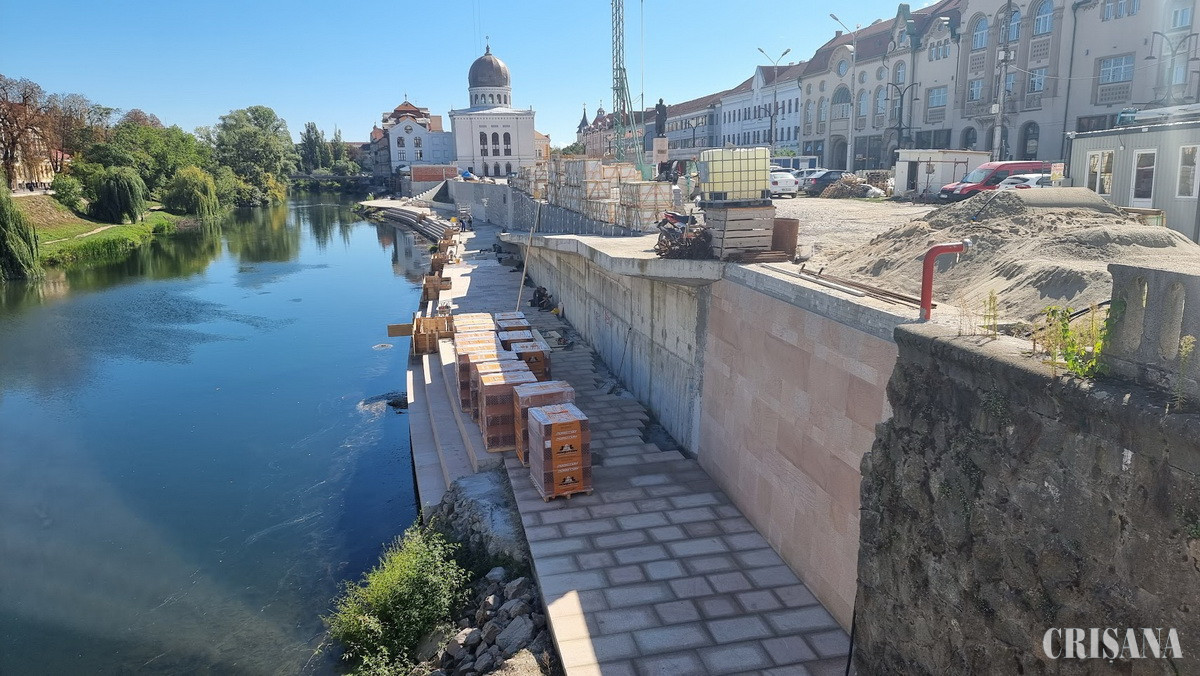„Dinspre Podul Sf. Ladislau spre Sinagogă a început placarea zidului de sprijin al malului și a pereților parcării subterane, pavarea treptelor și a platformei pietonale. Placarea se face cu plăci de granit auriu și cubeți de porfir. După finalizarea acestora, va urma montarea balustradelor și amplasarea mobilierului urban”, precizează Primăria Oradea.