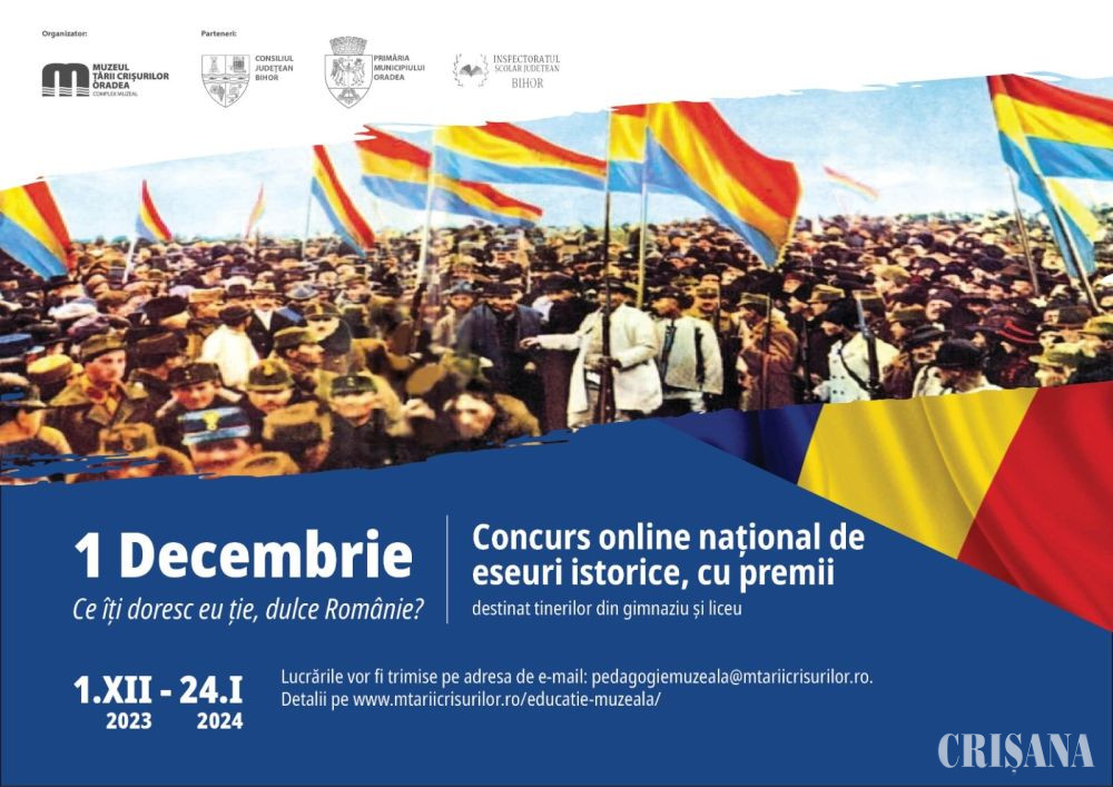 Muzeul Țării Crișurilor Oradea, Complex Muzeal, organizează un nou concurs online de eseuri istorice, având ca temă: 1 Decembrie - Ce îți doresc eu ție, dulce Românie? care este destinat tinerilor din gimnaziu și liceu.