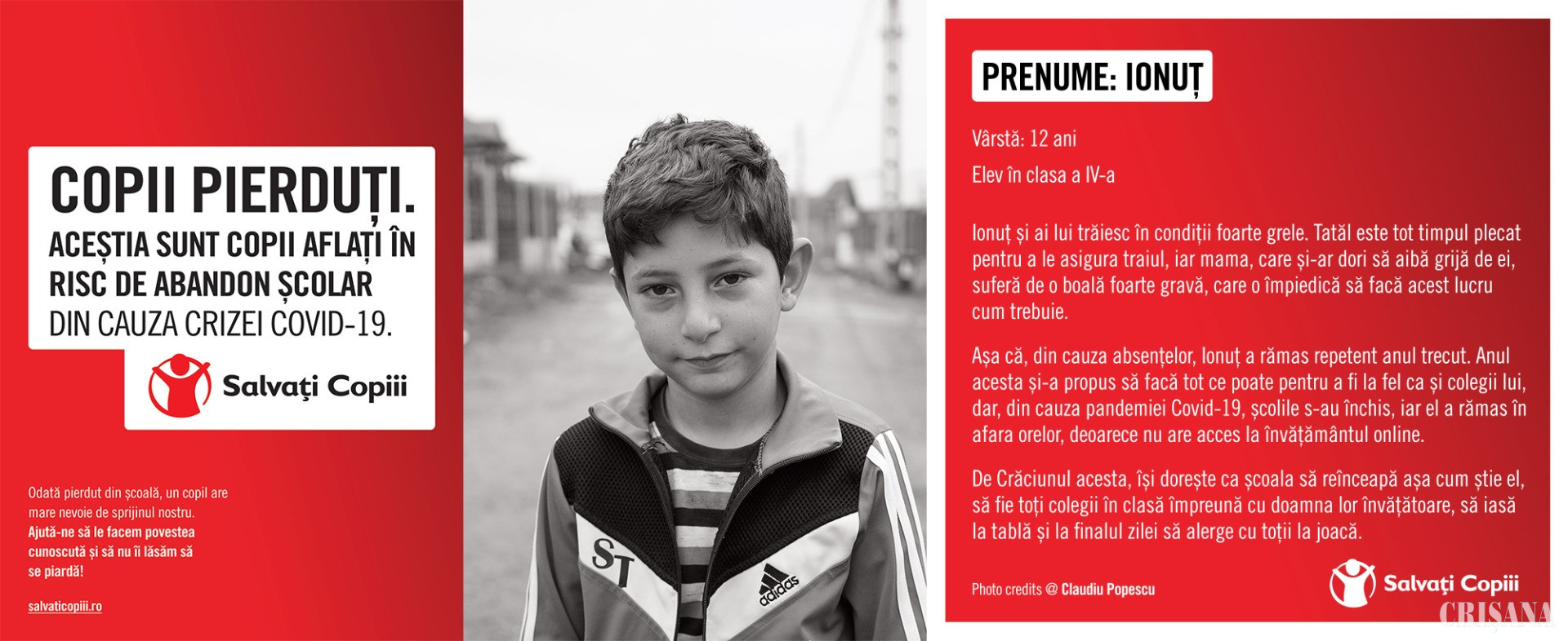 Salvați Copiii România lansează astfel campania manifest „Ajută-ne să nu-i lăsăm să devină #CopiiPierduti”, al cărei element central îl reprezintă expoziția de fotografie și invită publicul şi liderii opiniei publice, începând de miercuri, ora 11.00, până pe 10 ianuarie 2021, la Muzeul Național de Artă, pentru a descoperi poveştile copiilor vulnerabili.