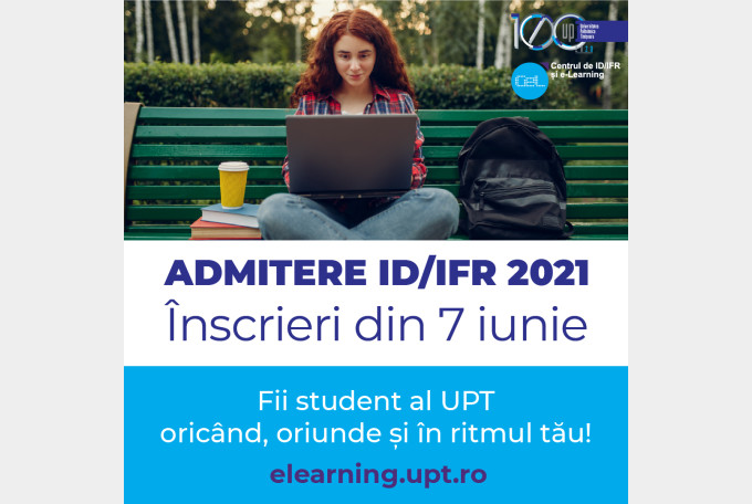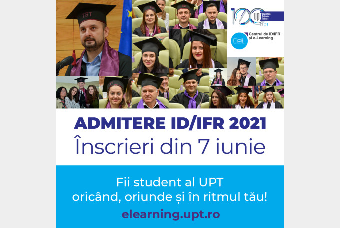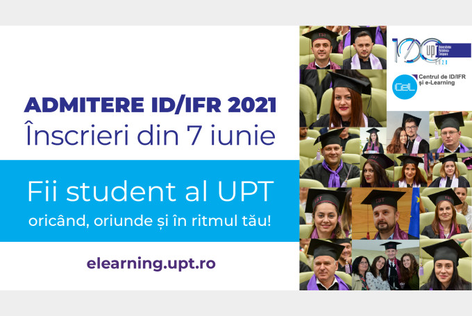 Fii student al UPT oricând, de oriunde și în ritmul tău! În 7 iunie dăm startul pentru concursul de ADMITERE ID/IFR 2021. Optează pentru înscrierea online sau la universitate! Cursurile și tutorizarea, comunicarea, temele și notele sunt administrate online prin platforma Campus Virtual UPT. Activitățile de laborator, seminar și examenele au loc numai în weekend. Cursurile și cadrele didactice, competențele, titlul și profesia sunt aceleași cu studiile la forma de învățământ la zi. Echipa de Suport dedicată ID/IFR îți stă la dispoziție, atât în perioada de admitere, cât și pe parcursul anilor de studiu!