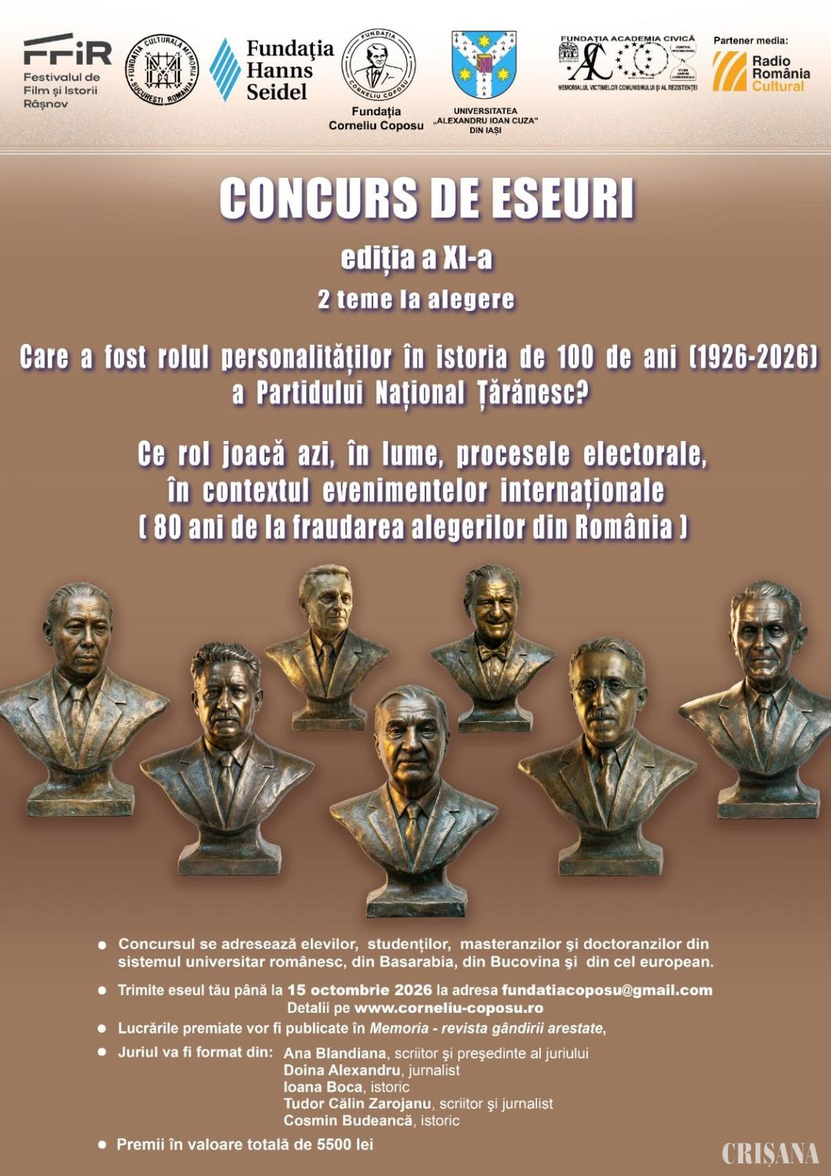 Fundația Corneliu Coposu, împreună cu prietenii și partenerii ei, Fundația Academia Civică, Universitatea „Alexandru Ioan Cuza” Iași, Fundația Hanns Seidel, Festivalul de Film și Istorii de la Râșnov, Fundația Culturală „Memoria” și Radio România Cultural, au plăcerea și bucuria să lanseze cea de-a XI-a ediție a concursului de eseuri, dedicat elevilor și studenților.