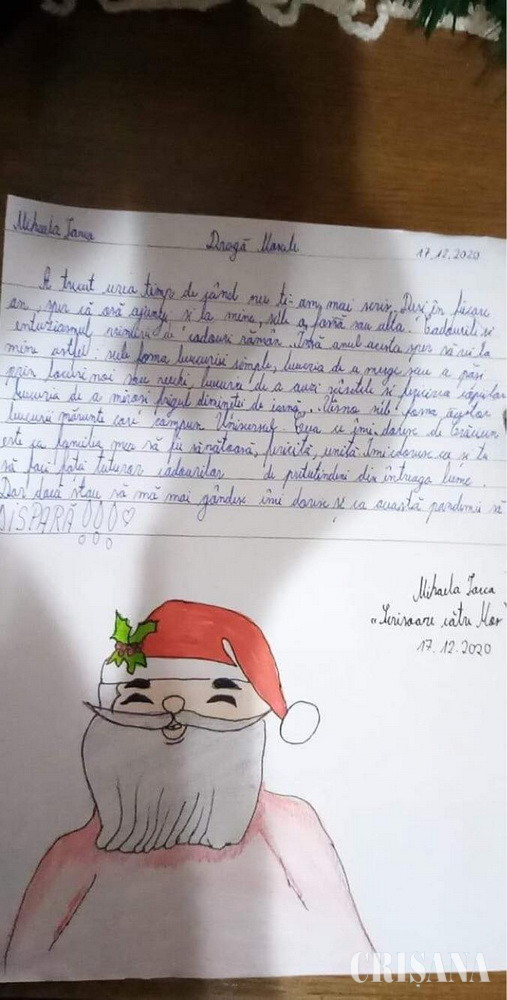 Astfel, fiecare copil din clasa a V-a A a scris o scrisoare către Moș Crăciun, în care au cerut, bineînțeles, lucruri materiale, dar, mai mult decât atât, au cerut lucruri spirituale, cel mai mult s-au gândit la persoanele din jurul lor și la persoanele care sunt singure și au nevoie măcar de un gând bun, dacă nu lucruri materiale. Cu siguranță, scrisorile reprezintă sufletele lor, sentimentele lor pure și sincere, pe care rar le mai întâlnim.