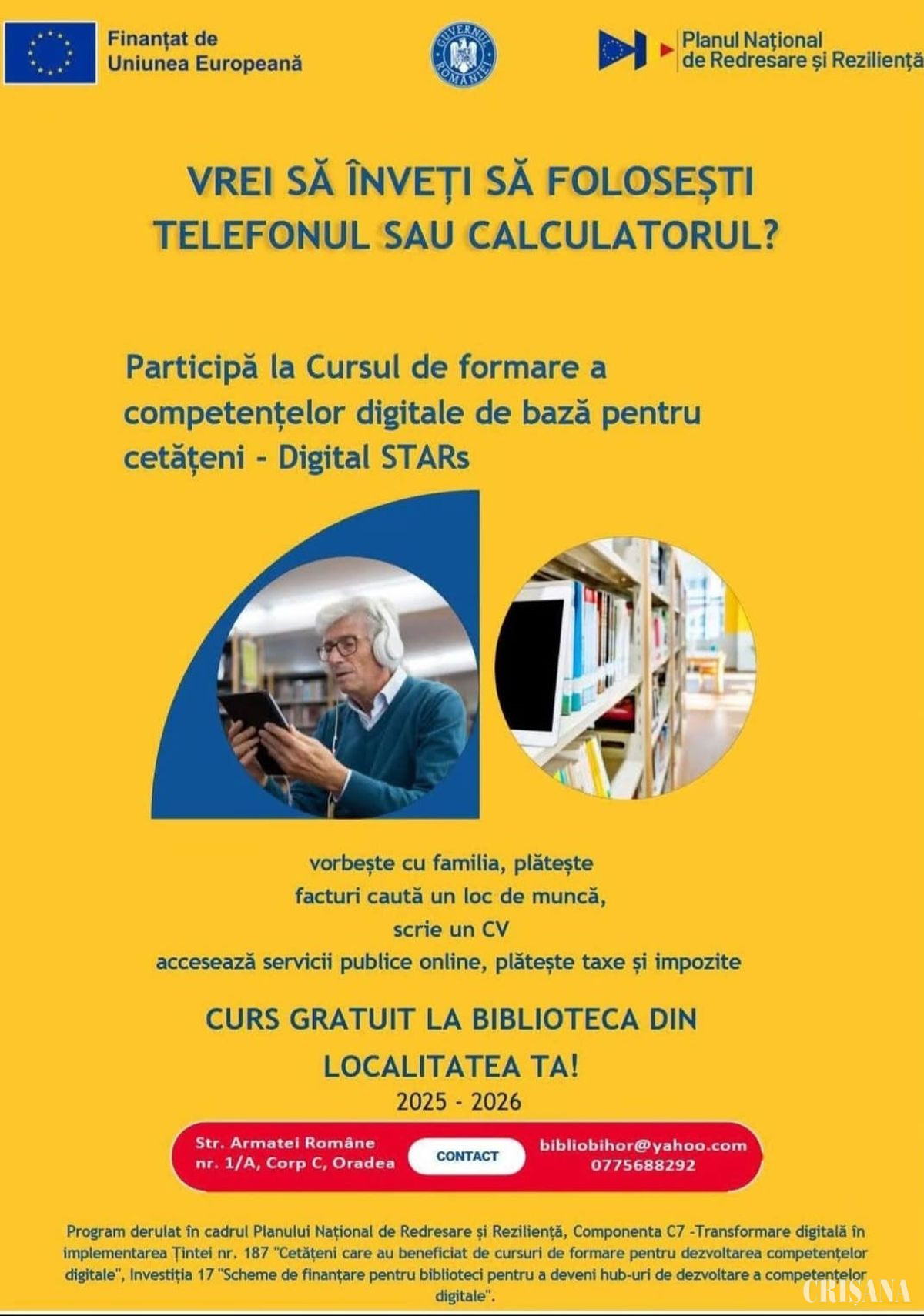 Proiectul de modernizare și digitalizare a Bibliotecii Județene „Gheorghe Șincai”, finanțat prin Programul Național de Redresare și Reziliență (PNRR) – Componenta 7 – Transformare Digitală, este în etapa de implementare a Cursului de formare pentru dezvoltarea competențelor digitale de bază pentru cetățeni, care va ține până în iunie 2026.