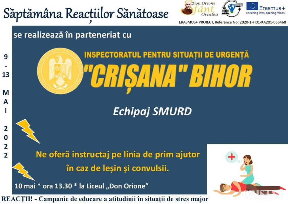Liceul „Don Orione” dedică o întreagă săptămână reacțiilor sănătoase, organizând, în perioada 9-13 mai, un set de activități și ateliere de lucru cu scopul de a educa atitudinea adolescenților în situații de criză/stres major.