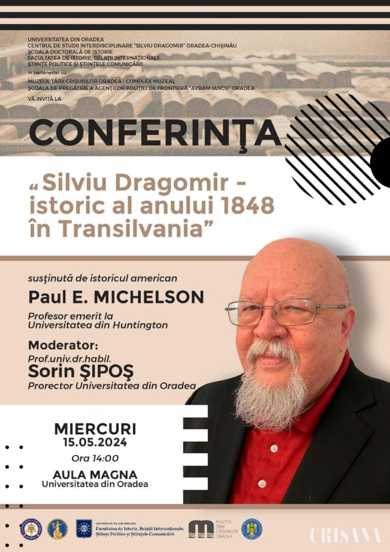 Paul E. Michelson, de la Universitatea din Huntington SUA, va conferenția, la Universitatea din Oradea, despre istoricul Silviu Dragomir și contribuția sa la scrierea istoriei anului revoluționar 1848 în Transilvania.