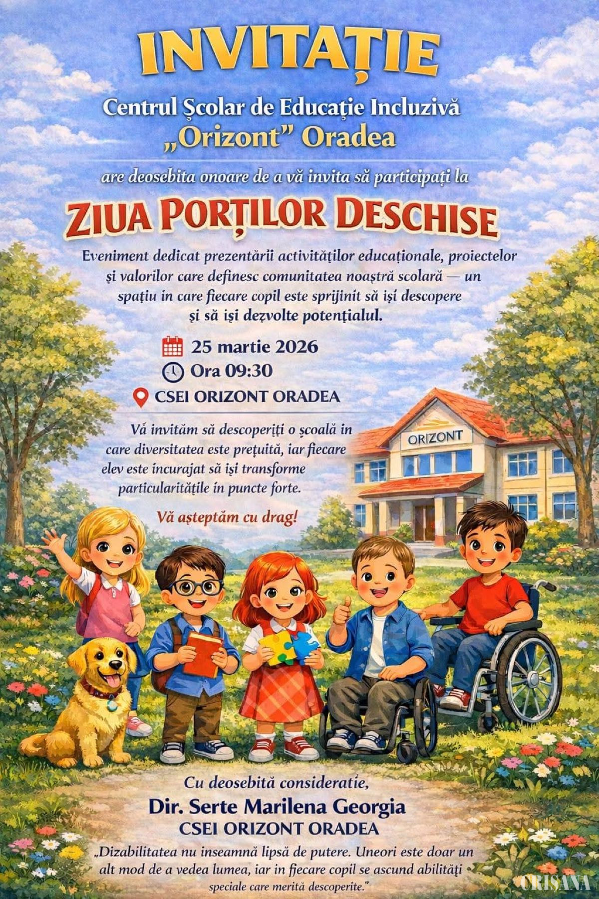 Miercuri, 25 martie, în intervalul orar 9.30-12.30, la Centrul Școlar de Educație Incluzivă Orizont din Oradea, situat pe strada Traian Lalescu nr. 3 (lângă Stadion), va avea loc evenimentul intitulat „Ziua porților deschise”.